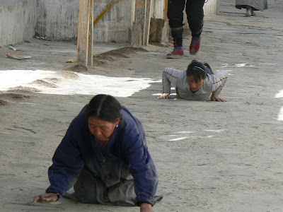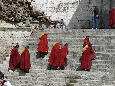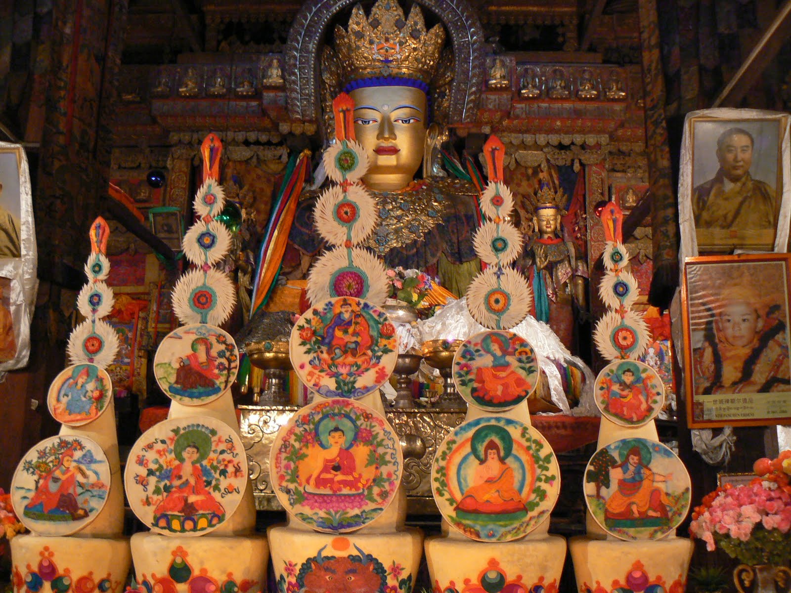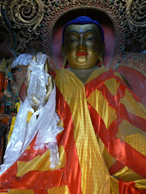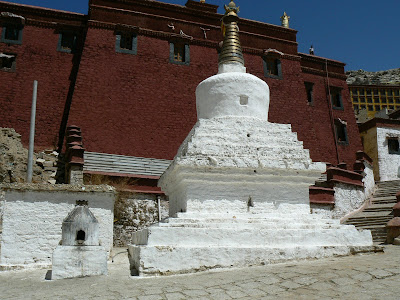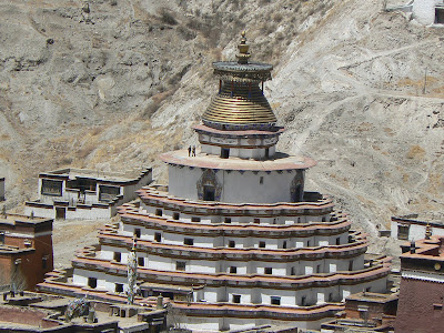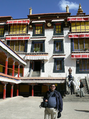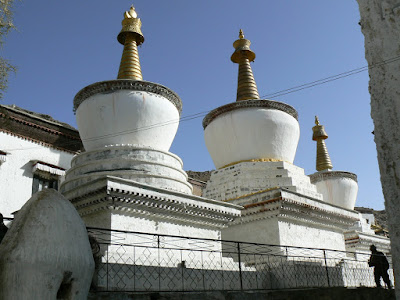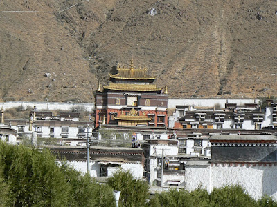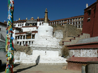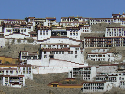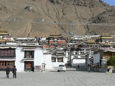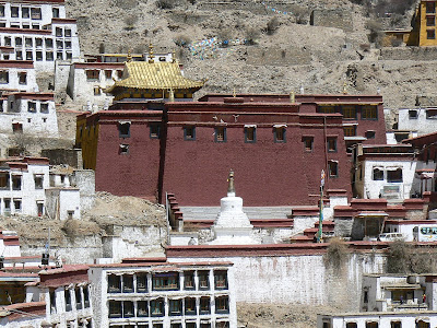 Manastirile tibetane sunt intr-adevar un festival vizual. Extrem de colorate, un contrast binevenit cu relieful destul de auster din jurul lor. Manastirile sunt un complex de cladiri, adevarate sate cu ulite intortocheate, cu chilii pentru calugari, cu sali de adunare grandioase, cu statui gigantice ale diverselor manifestari ale lui Buddha. Peste tot ard lumanari facute din unt de yak (albinele nu prea traiesc la 4000 de metri !), miros de betisoare parfumate arse, murmur de mantre. In anumite manastiri, se afla chörten-e, niste sarcofage imense in forma de stupa, pentru care nu s-a facut economie de aur si pietre pretioase in care se pastreaza ramasitele pamantesti ale diversilor lama.