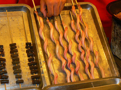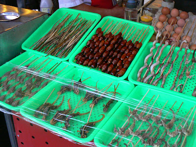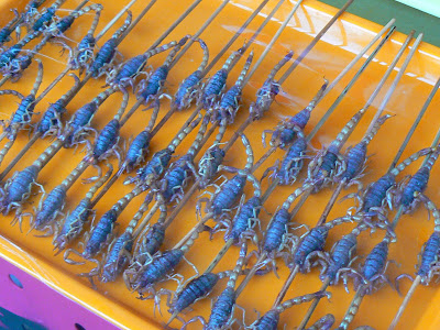 Pentru o seara mai exotica, daca nu te decizi in care din cele mai multe mii de restaurante sa te opresti, poti sa mergi pe strada Wangfujing, principala artera pedestra comerciala din Beijing, La un moment dat, dupa un colt, gasesti mai bine de 100 de standuri cu street food care se pregateste la minut… daca esti mai conservator, ai parte de clasicele shish kebab de miel sau porc, daca esti mai aventuros, poti sa alegi frigarui din carne de sarpe, scorpioni la gratar sau gandacei savurosi ! Grabeste-te, insa, acest colt exotic inchide in jurul orei 21:00. Dupa aceasta ora, nu prea gasesti de mancare in zona, cam totul se inchide… dar sutele de baruri de langa Drum Tower vor fi insa arhipline, inainte de a te avanta printre bautorii si bautoarele de coniac frantuzesc de fite din China Dolls pentru o noapte speciala.