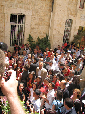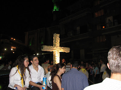 In primul rand, cred ca a ajutat ca am stat intr-o mica pensiune detinuta de un palestinian crestin, revenit din Australia dupa cateva decenii petrecute acolo. Pensiunea situata pe zidul de cetate care inconjoara orasul vechi este in mijlocul cartierului crestin. Tot el ne-a recomandat sa mergem intr-o zona din orasul nou unde crestinii participa la o procesiune de vinerea mare… Si atunci am simtit puterea comunitatii crestine. Am ajuns intr-o zona a Damascului care nu se deosebeste prea mult de orasele sud-europene mai bogate, un loc unde mii de oameni imbracati “de duminica” se intalneau langa catedrala maronita si urmau sute de copii imbracati in uniforme cu cruci sau torte aprinse, batand din tobe in urma unei cruci imensa purtata de niste adolescenti… Era ceva ciudat si aveai sentimentul intrarii in transa… procesiunea avea ceva dintr-o parada militara, tobe, pas de defilare – chiar si la cei de varsta primilor ani de scoala, torte… dar te tragea sa-i urmezi si tu in defilare prin cartierul crestin… unde toate ferestrele erau luminate cu un soi de lampioane cu cruci.