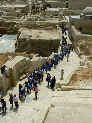 Nu trebuie insa sa uitam nici Alepul, poate orasul cel mai vechi din lume, locuit neintrerupt unde spectacolul bazarului este de neuitat. La Alep, nu este nici bazarul turistic de la Istanbul, nici bazarul obositor de la Cairo sau cel cam steril de la Dubai. Bazarul din Alep este un bazar adevarat, al locuitorilor din Alep care vin aici in mod natural sa-si faca shopping-urile, iar faptul ca esti strain nu atrage o atentie deosebita… nici nu sunt prea multi straini… te poti plimba in voie, observa viata cotidiana sau descoperi cine stie ce comoara prin zona rezervata covoarelor, aurului si bijuteriilor de orice feluri… La capatul bazarului, se afla Citadela, superba citadela a Alepului, luata cu asalt de cruciati acum aproape un mileniu, astazi luata cu asalt de sute de copii adusi aici de invatatorii lor. Iar daca sunt turisti straini prin preajma, nu poti sa scapi fara cateva sute de poze… Ca si la Damasc, Alepul are o zona crestina, impanata de biserici si de restaurante exceptionale.