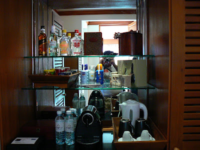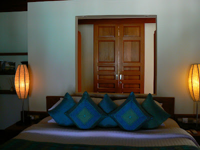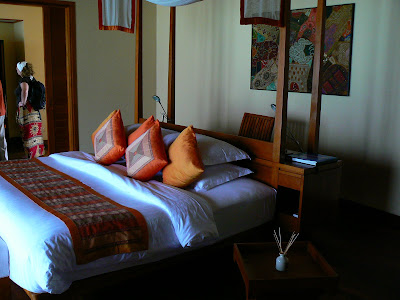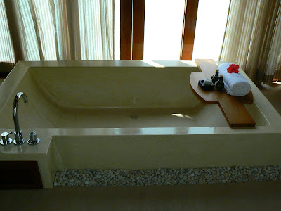 Deci, am luat-o la picior… pe plaja alba, cu picioarele prin apa. Ghidul ne spune cate camera au. Nu mai retin, au destule, sa nu va fie frica. Sunt vreo 6 tipuri – Beachfront Villa, Beachfront Pool Villa, Over-Water Bungallow, etc. Faptul ca am avut un ghid ne-a ajutat foarte mult. In primul rand, ne-a deschis usile la 2 camere si asa am putut sa vedem cum arata o camera care costa vreo 800 – 1000 dolari pe noapte (daca cumparam de pe site-ul hotelului). Sincer, mi-a placut mai mult camera de pe pamant… De fapt, nu sunt niste camere, sunt mai mult niste bungalow-uri. Pe langa sufrageria mare, deschisa si cu un aer conditionat perfect, din sufragerie poti sari direct intr-o mica piscina private… desi marea cea verzuliu-albastra e la doi pasi. Cea mai tare este baia – este in aer liber !!! Daca vrei sa faci o baie, sa faci dus sau chiar sa folosesti WC-ul, totul este in natura… evident spatiul privat este bine protejat de un zid… Sincer, ideea mi-a placut rau si mi-am adus aminte de WC-ul si dusul din balcon de la un hotel budget din Bangkok….