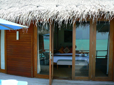 Ghidul ne-a dus si intr-un over-water bungalow, una din celebrele cabanute construite peste mare atat de fotogenice. Ce e distractiv, ideea a venit de la casele asiatice de pe apa in care stau de obicei cei mai saraci locuitori ai zonei… iar Maldivele, Noua Caledonie sau Seychelles au preluat conceptul si l-au transformat intr-o idée de lux. Cabanutele au sufragerie, dormitor, o baie (din pacate nu in aer liber) cu privire la mare, o veranda din care poti cobora pe o scara in mare… si evident un mini-bar care arata ca un mini-supermarket plin de bauturi mai ales alcoolice (intr-o tara in care alcoolul este interzis !)…