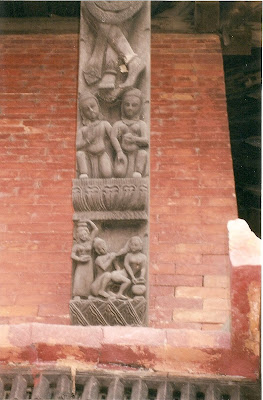 Sculpturi erotice pe un templu nepalez din Varanasi\