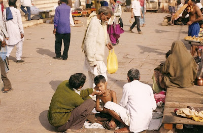 Plimbarea pe malul Gangelui este fabuloasa. Totul, absolut totul nu poate sa nu-ti sugereze ca e un lucru sfant – sute de oameni se balacesc intr-o apa absolute imputita, mii de vaci se plimba pe maluri, peste tot se fac puje, iar zidurile cladirilor, adevarate palate sunt pictate cu imaginile lui Vishnu, Shiva, Rama & co. Nu dureaza mult si am parte de companie… Un tip istet, vorbitor de limba engleza destul de bine intra in vorba cu mine… imi povesteste ce e pe acolo… Imi spune ca ne invidiaza ca noi, sahibii suntem ca fluturii… De ce ca fluturii ? Zburati peste tot, nu aveti probleme, vedeti multe locuri noi, interesante… Probabil are dreptate. In fine, ajungem si la subiectul fierbinte – fratele lui are un magazin de matase, n-as vrea sa-l vizitez… Nu, dar ii promit ca a doua zi ma voi plimba cam in aceleasi locuri cu doua fete, sigur dornice de matase ! Ajung si la locul in care sunt incinerati mortii. Fac o donatie pentru cumpararea de lemne. Mii de saraci se tarasc spre Varanasi si nu au bani pentru incinerare… Lemnele sunt putine si scumpe, asa de multe ori, unele cadavre asteapta destul pana sa fie arse… si atunci sunt arse partial ca nu s-a strans atata lemn cat trebuie… asa ca se iau partile din corp nearse, ba o mana, ba un cap si se arunca in Mama Ganga…