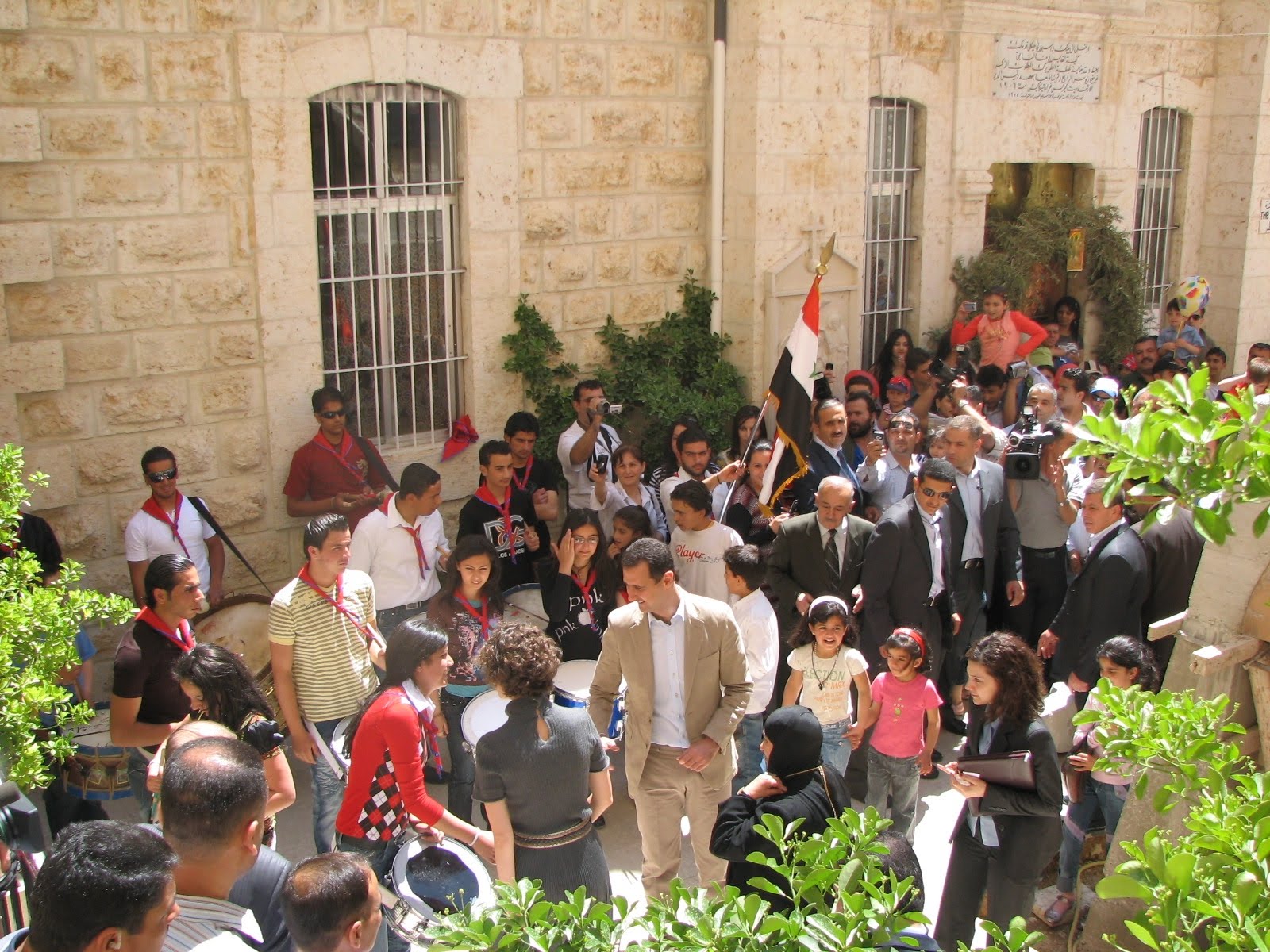 Dupa ce Bashar si-a terminat pelerinajul, a coborat in curtea mare a manastirii unde tinerii scoutsi crestini au batut cu forta din tobe – au cantat imnul Siriei, diverse alte marsuri si spre marea mea surpriza, cateva acorduri din imnul Statelor Unite ! Odata concertul terminat, Bashar nu a mai avut ce face, dar a trebuit sa se supuna dorintei tuturor sa-l pozeze… Dupa sesiunea de poze, a coborat prin multime, a strans sute de maini si s-a urcat in masina… Intre timp, cam tot satul s-a strans ca la circ, multi comportandu-se ca o galerie a unei echipe de fotbal…