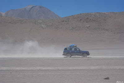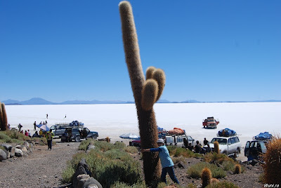 O alta varianta foarte populara de a intra in Bolivia este din Chile. Probabil in 90% din cazuri cu tur prin Salar de Uyuni si Sud Lipez, o zona extrem de frumoasa, cea care ne-a atras pe noi prima data catre Bolivia. Se afla in sus-estul Boliviei, si este una dintre cele mai salbatice si mai spectaculoase regiuni din tara, si poate si din America de Sud. Cu toate acestea, nu e pustie. Zeci de 4×4 bat zilnic drumurile de pamant, plimband gastile de turisti cam pe la aceleasi obiective. Traseul este cea mai populara metoda de a trece din Chile in Bolivia sau invers, si presupune un tur de 3 zile, 2 nopti, intr-un jeep impreuna cu alti 5 turisti. Turul include transport, cazare, 3 mese pe zi, si un sofer/ ghid. Costul din Chile in Bolivia este in jur de 130USD, iar invers este cam 85USD (chiar si de la aceeasi companie, costurile plecand din Bolivia sunt mult mai mici). Venind din Chile se vede mai intai zona Sud Lipez, o zona desertica. In prima zi se viziteaza Laguna Verde peste care troneaza vulcanul Lincanbur, niste bai termale, o zona de geizere, si Laguna Colorada. Depinde mult si de noroc (cat de mult a plouat de curand, daca bate vantul etc.) dar zona este extrem de frumoasa, chiar si cand imparti privelistea cu inca vreo 30 de turisti, din alte 5-6 jeepuri. In a doua zi se viziteaza o zona cu formatiuni de piatra, printre care si arborele de piatra, o zona cu vulcani, si foarte multe lagune. In a treia zi se ajunge in Salar de Uyuni, cel mai mare salar din lume, ramas in urma unei mari care s-a epavorat in urma cu cateva milioane de ani. Zona este superba, nu se vede nimic decat sare cat vezi cu ochii, la propriu. In mijlocul salarului se viziteaza o insula cu o padure de cactusi gigantici, iar la marginea salarului se viziteaza un hotel de sare. Ultimul punct inainte de a ajunge in Uyuni ar trebui sa fie o oprire la cimitirul de trenuri, dar multe agentii „sar” acest obiectiv.