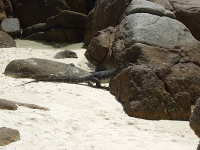 Spectaculos e putin spus. Mai exotic de atat nu se poate. Doua insule in care omul si-a facut treaba doar in primii 100-200 de metri de la mal (plaja, cabane, restaurante), restul fiind lasat la atitudinea junglei. Aproape ca la inceputuri. Plaja fina si apa in culori dementiale, totul arata ca o mare piscina in mare. Cu aceasta ocazie am avut oaspete printre noi si un varan mult prea speriat incat sa stea la poza mai mult de cateva secunde. Oricum aparitia lui la cativa metri de noi a fost un spectacol total, gustat din plin.