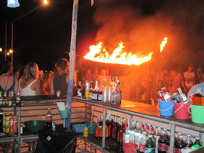 Dar nu pentru toata lumea FMP se dovedeste a fi atat de distractiva. Din loc in loc, pe plaja, sunt locuri special amenajate pentru a-i pune la somn pe cei atat de beti incat li se taie filmul, punctele de prim ajutor sunt luate cu asalt de petrecareti taiati (NU e o idee buna sa te plimbi descult pe plaja la FMP), batuti, juliti si invinetiti, oamenii sunt pradati de multimea de hoti de buzunare, s-a auzit de violuri, talharii si chiar decese. O intamplare socanta la care am fost martora: langa noi, la bar, un tip si niste tipe, toti cu destul alcool la bord, comanda shot-uri. Fetele beau si pleaca. Cand da sa plece si tipul, fara sa plateasca, barmanul il prinde de cot si ii cere banii. Tipul refuza, asa ca pana sa clipesc de doua ori, barmanul ia o sticla de bere si ii arde una drept in moalele capului. Omul isi pune mana pe crestet si realizeaza ca e plin de sange, moment in care decide sa se indeparteze. Dar barmanul infuriat pare decis sa nu-l lase sa scape asa de usor, asa ca sare peste tejghea si ii mai arde o sticla in cap, in urletele inspaimantate ale asistentzei. Te gandesti ce-ai face intr-o astfel de situatie. Eu, cand l-am vazut pe barman ca se urca pe tejghea sa il mai loveasca pe tip inca o data, am intins mana sa il opresc, dar mi-am retras-o la timp pentru ca sunt convinsa ca mi-ar fi ars si mie una, intr-atat era de furios.