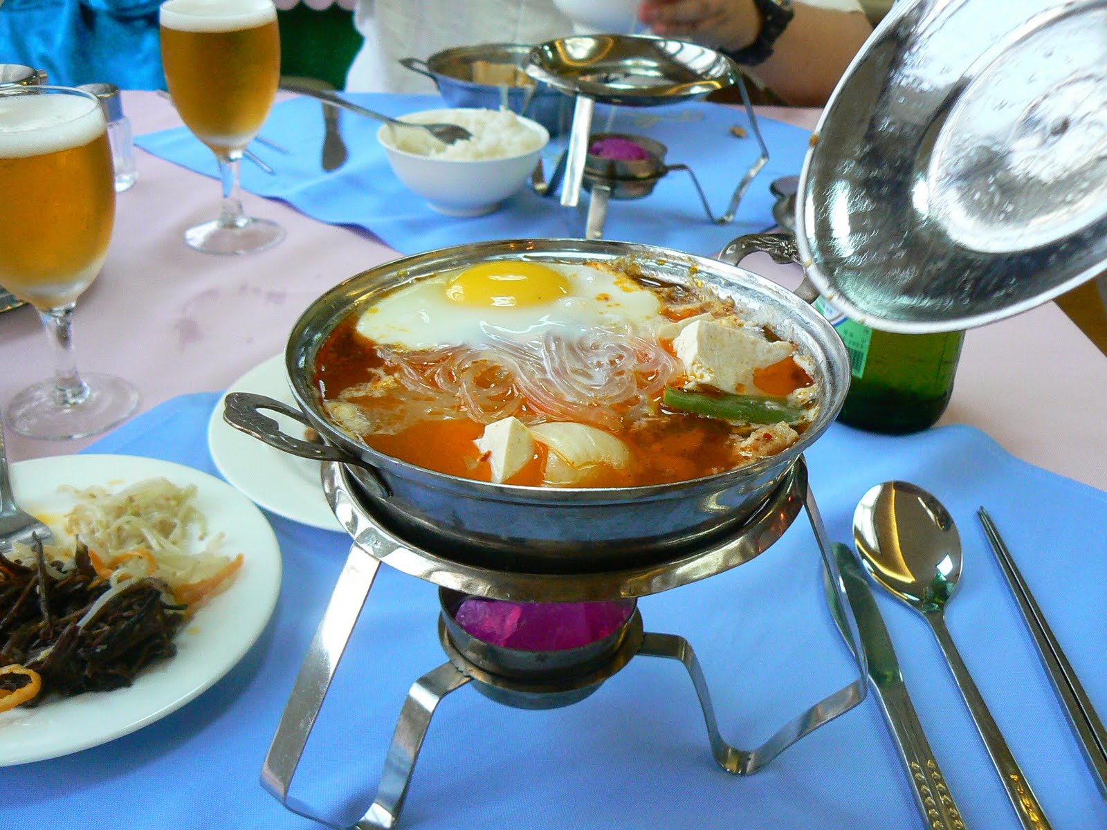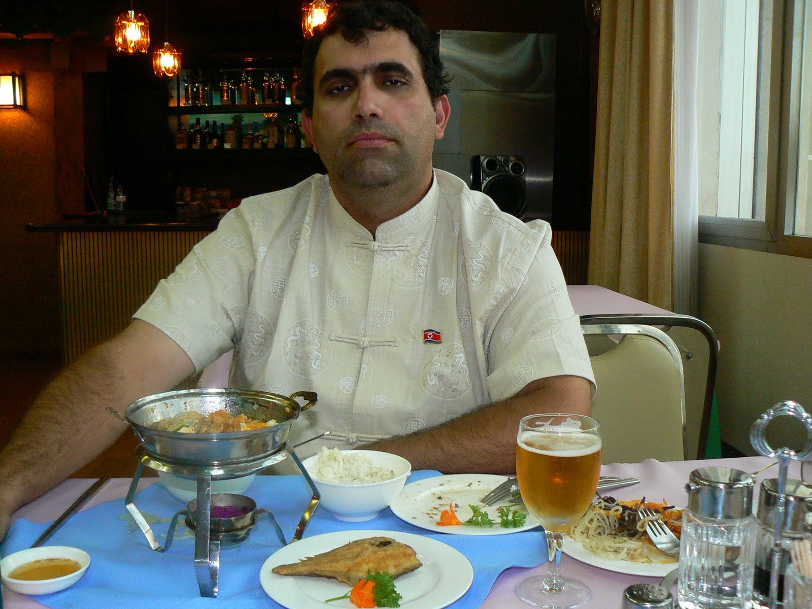 Ca de obicei, am avut mancare din plin. Mancare coreeana, adica nu stiu exact din ce e… Cert nu e din caine, ne-a asigurat ghidul, doar sudistii mananca caine. Ticalosii ! Si ca veni vorba de mancare… nu am vazut nici un magazin de mancare prin Pyongyang. Vreun aprozar, vreo alimentara goala, nimic… Mi s-a explicat ca sunt in alte parti ale orasului (desi l-am strabatut cam in lung si in lat). Probabil se mananca la cantina numai. In cazul nostru, aveam mancare cat pentru tot cartierul, iar ghizii radeau tot… Noi ciuguleam ici si colo, nu pot spune ca mancarea coreeana este exact pe gustul meu, dar tot gaseam cate ceva…