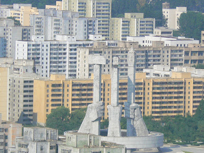 Urmatorul obiectiv este unul dintre monumentele “grele” din Pyongyang – Turnul Ideii Ciuce… Am mai scris de ideea Ciuce… ce e ideea Ciuce ? In primul rand, nu este Ideea Ciuciu cum unii dintre voi, mai carcotasi ati spune, este filozofia de baza aflata la baza Coreeii de Nord, emanata de ati ghicit cine… the Great Leader. In engleza, I se spune “Juche Idea” (cred ca un traducator roman mai mucalit i-a spus in romaneste “ciuce”) si vine din gandirea profunda ca “omul este stapanul a orice si decide orice”… este stapanul lui insusi… Dau din cap patruns de idée…. Incredibila descoperire… Nu m-as fi gandit niciodata la o filozofie atat de profunda… Dar asta e doar ideea initiala, ea a mers mai departe ducand ideea la filozofia autarhica de “incredere de sine” si de “auto-suficienta” – a mai fost nevoie de doar 2 pasi pentru a se stabili ca Republica Populara Democratica trebuie sa se bazeze numai pe ea insasi si sa-si produca totul ce are nevoie (sau, ma rog, ce se considera ca e nevoie).