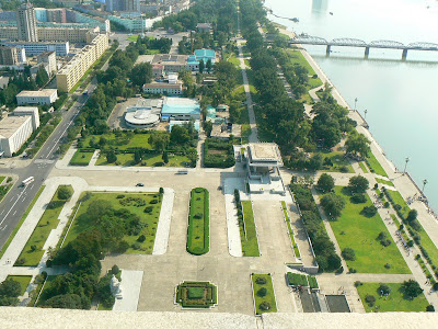 Se poate urca in varful lui si merita toti cei 5 euro pe care i-am dat. De sus, intr-o zi frumoasa, ai parte de o priveliste superba… De o parte, cartiere de blocuri cuminti aliniate, fix vis-à-vis Palatul de Studiu, putin mai la dreapta statuia lui Great Leader… in varful stalpului se afla o chestie rosie care ar vrea sa sugereze un soi de facile olimpica, iar altora, mai carcotasi si mai perversi, le sugereaza altceva.