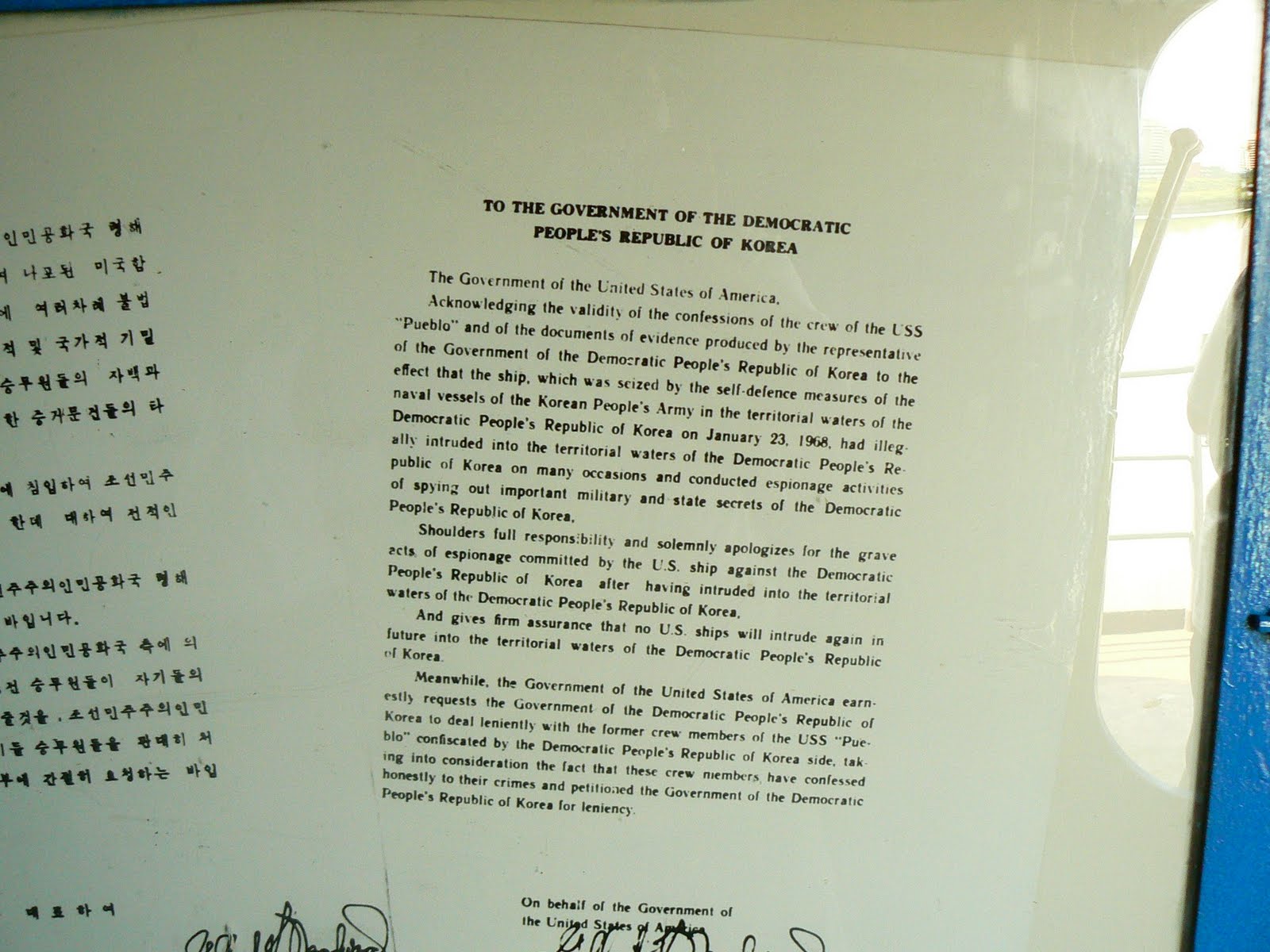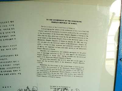 Cum noi nu suntem spioni americani (desi probabil suntem suspecti), avem acces pe vas unde o femeie-soldat ne explica ce si cum… Totul a fost pastrat ca in 1968 – inclusiv tehnologia de interceptare de comunicatii… Vedem scrisori si filme cu echipajul care se bucura de o gazduire ca in sanul lui Avram (odata ajunsi in America, vor povesti despre torturarea lor si despre executii false pentru a-i face sa recunoasca). Intr-un final, cei 82 membrii ai echipajului sunt eliberati in Coreea de Sud (trecand pe jos pe “Bridge of No Return” – poza e pe vas) doar dupa ce SUA trimite o scrisoare oficiala de scuze si promisiuni ca nu-i vor mai spiona pe nord-coreeni. De altfel, nord-coreenii au o pasiune pentru acest tip de scrisori de scuze, prin toate muzeele e plin de astfel de scrisori puse la loc de cinste.
