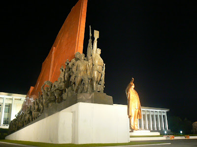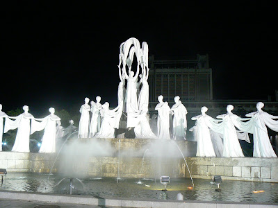 Ne ducem unde altundeva decat la monumentul lui Great Leader. E luminata cu toti lucsii puternici, iar cuprul straluceste de departe. De fapt, in noaptea precedent pe la 2 noaptea era singura lumina din oras, un adevarat far calauzitor al orasului. Nu departe, e o zona cu fantani arteziene cu tot soiul de personaje mitice – gen muncitori, balerine, etc… Aici vad cateva cupluri mult prea alternative care se plimba prin peisajul relativ romantic… Sa nu credeti ca fac cine stie ce, se comporta in spiritul si litera eticii si echitatii, dar ce cauta la ora asta pe aici ?