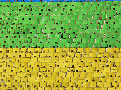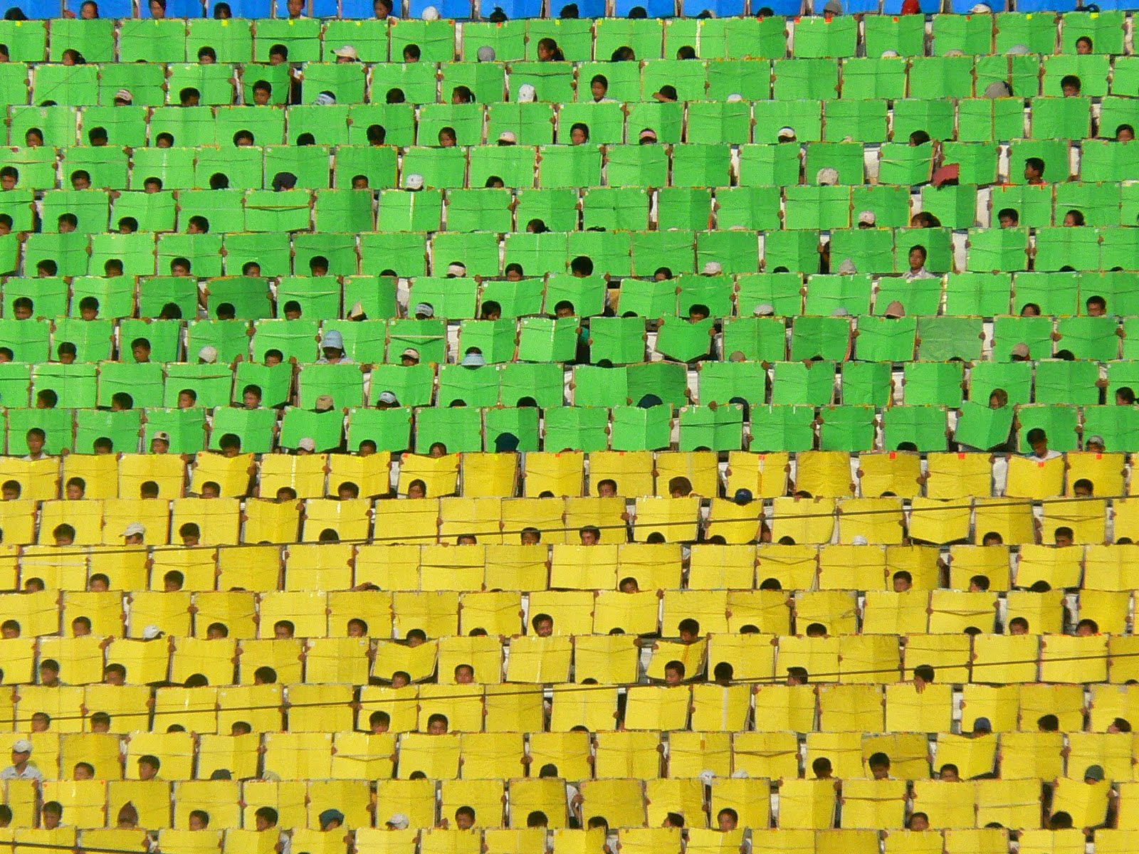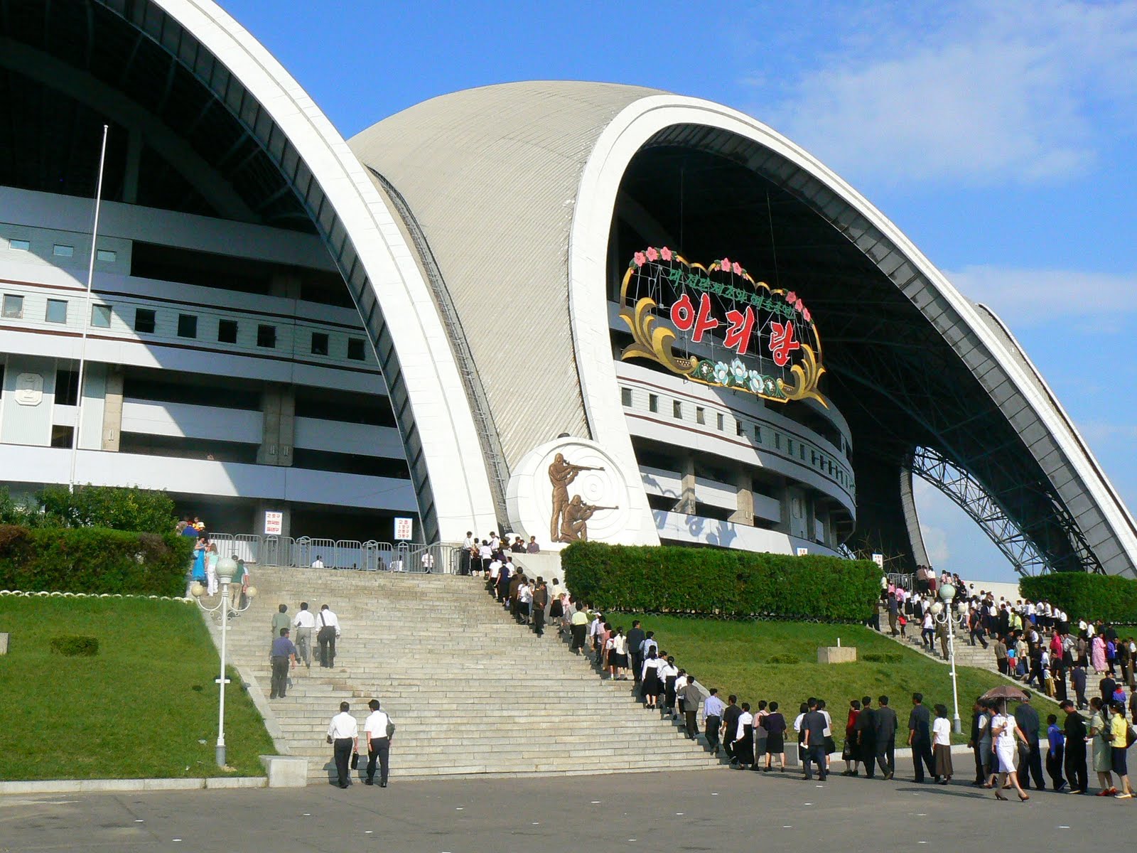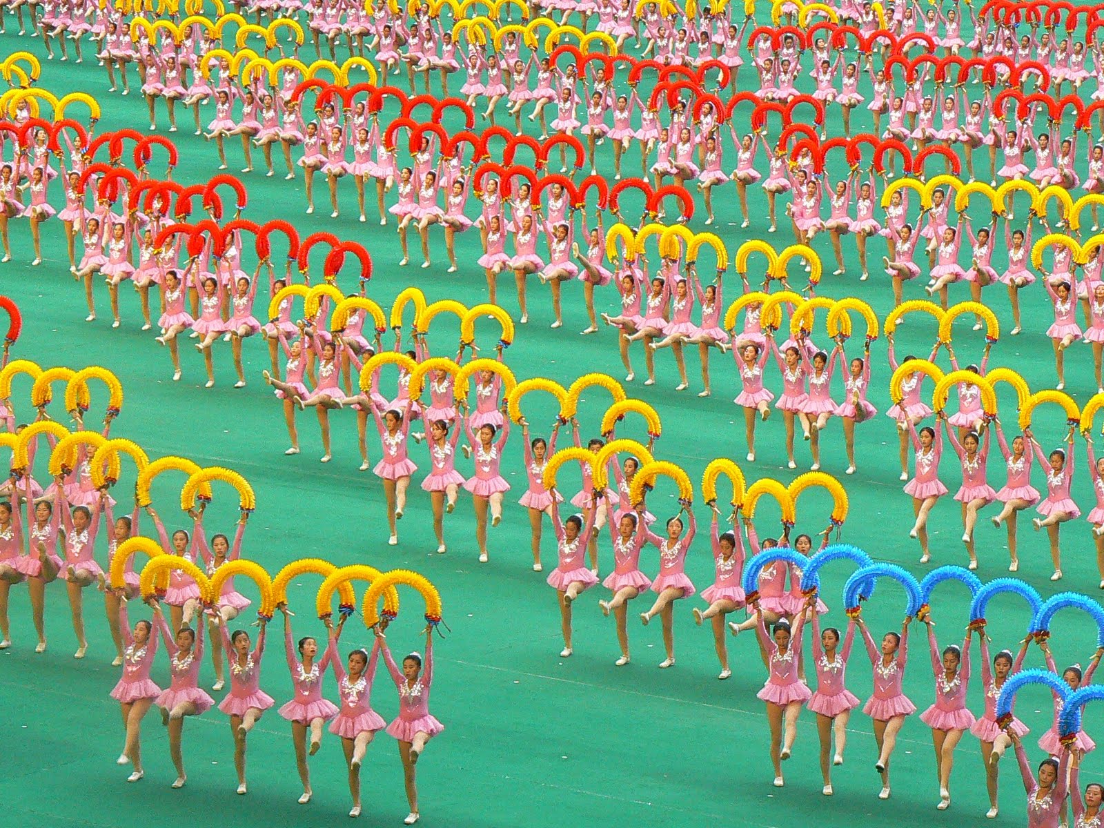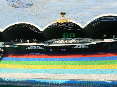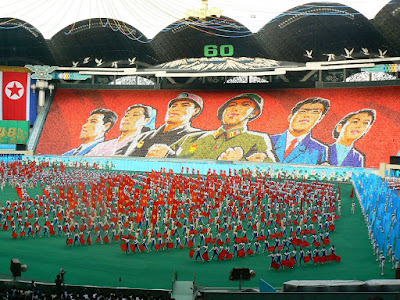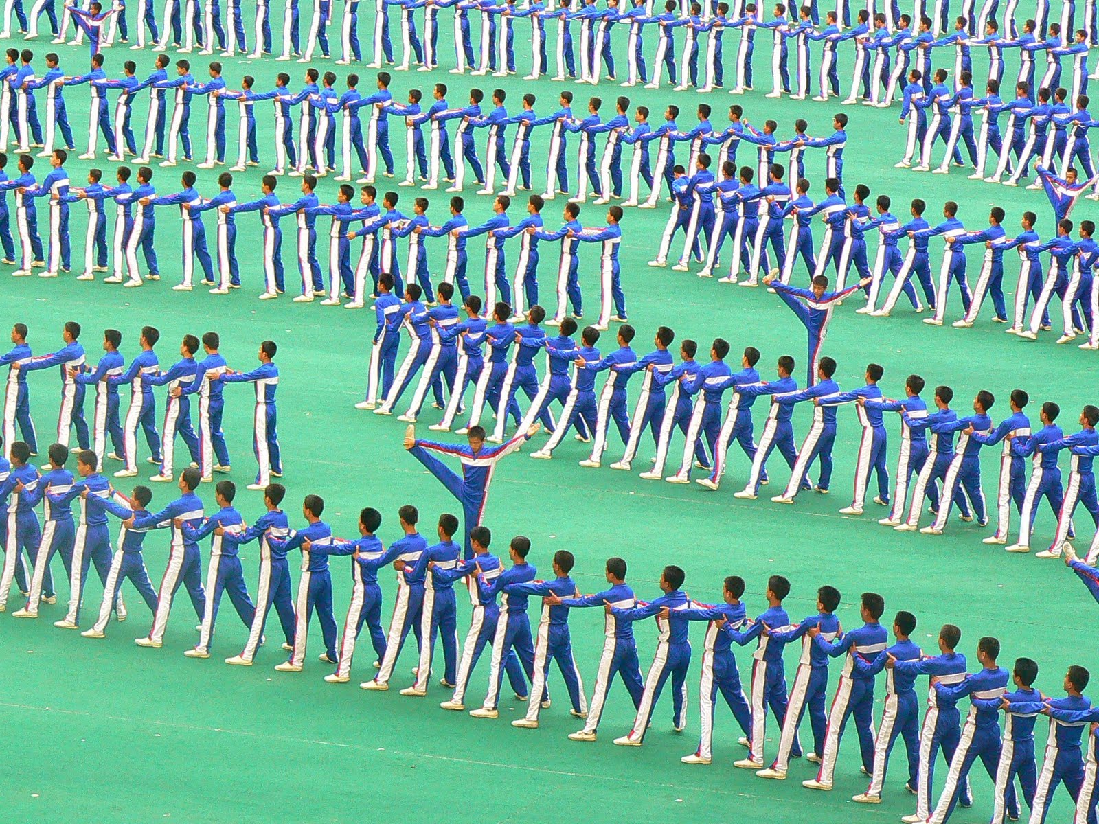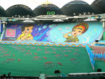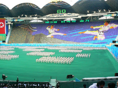 Ne urcam in microbuz si o taiem spre stadionul 1 Mai. Daca Arirangul este noaptea, “Mass Gymnastics” este ziua, deci nu vor mai fi lasere, artificii si alte nebunii pirotehnice. In schimb, zecile de mii de participanti sunt la locul lor. Show-ul nu este la fel impresionant (poate il vad prea repede, la doar o zi dupa “the best of”), dar as scrie cu pacat ca nu mi-a placut… E cu adevarat interesant, aceleasi mii de oameni perfect corelati, copii, sportive, nu mai vad forte militare (deci nu mai sunt marinarite dansatoare), in schimb foarte multa gimnastica. Apar si karatistii, dar fiind ziua si deci lipsind culorile si luminile, mi se pare cumva mai relaxat.