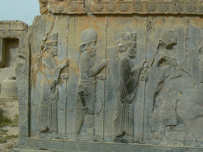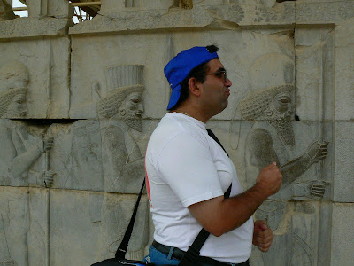 Ne invartim pe platoul inalt inainte de a intra in Palatul Apadana, resedinta sahului sahilor. Imperiul persan al ahemenizilor se dorea un imperiu universal, un imperiu care nu dorea sa cotropeasca si sa asimileze, ci un imperiu care sa graviteze in jurul unui rege al regilor, asa cum si religia zoroastriana gravita in jurul unui zeu unic, Ahura Mazda. In fiecare an, popoarele supuse veneau sa aduca daruri si sa-si aduleze stapanul suprem – basoreliefurile pastrate in conditii bune ii infatiseaza pe etiopieni, pe egipteni, pe capadocieni, pe indieni, dar si pe traci, din familia carora au aparut si stramosii nostrii, dacii… Ma uit cu atentie – nu prea arata cu imaginile din Roma Antica… au insa caciulita de tarabostes pe cap, dar moda din jurul anilor 300 i.Hr era diferita cu cea din vremea lui Decebal, fiul lui Scorilo.