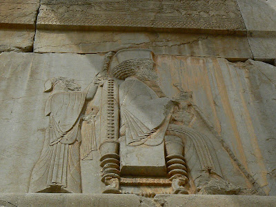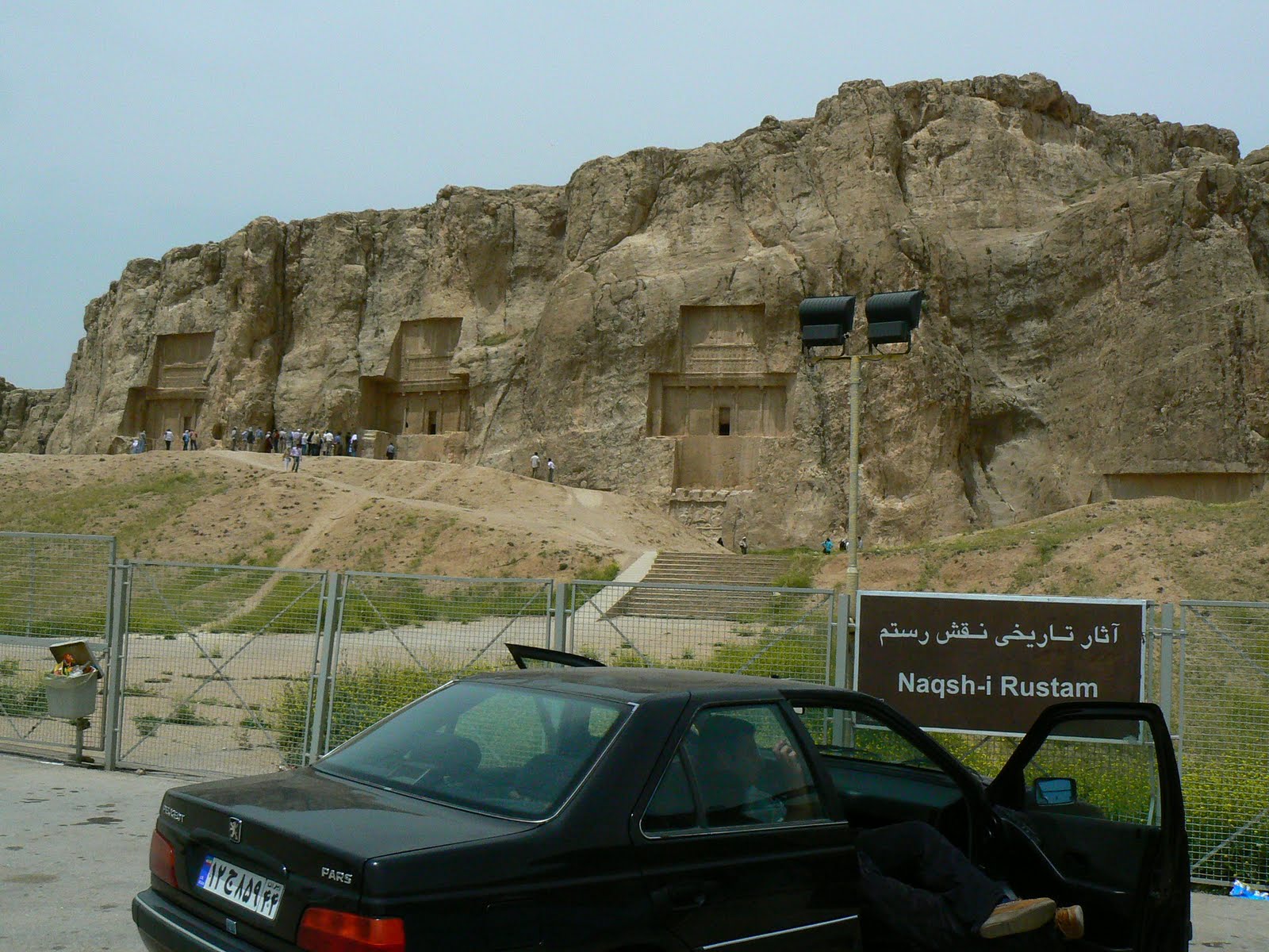 Trecem prin zona turistica de unde putem cumpara o Cola rece sau un ceai cald si plecam mai departe. Oprirea urmatoare la Naqsh-i Rustam, necropola regilor regilor. Aici, intr-adevar, sculpturile sapate in piatra pot pune Petra in umbra… Si aici, sunt toti marii regi – diversii Darius, Xerxes si Artaxerxes… Sa nu credeti ca veti gasi vreun sarcofag al vreunui rege… Nu au avut niciodata. In religia zoroastriana, trupurile neinsufletite erau lasate sa fie devorate de vulturi pentru a nu polua pamantul cu cenusa sau cu trupul inmormantat. La picioarele acestor morminte, din cand in cand, intercalate, sunt sculpturi redandu-i pe regii parti – prezenta lor aici se legitimizau ca fiind adevaratii urmasi ai ahemenizilor !