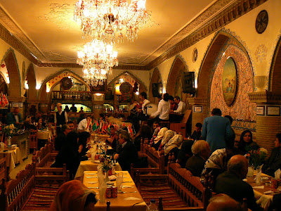 Seara am petrecut-o la un restaurant din nord. Dupa ce l-am cautat cu taxiul pe mai multe strazi, am oprit in fata unei intrari flancata de faclii… E un restaurant cool, dar traditional, plin de lume buna, dar si cu un neasteptat program artistic. Autoritatile islamice au ce au cu muzica, de multe ori sunt interzise evenimente publice, dar se pare ca regula nu este de fier… Iar cantaretii pun patos, asa ca este un spectacol placut, pe langa déjà clasicul kebab cu oraz, bine udat de bere cu rodii.