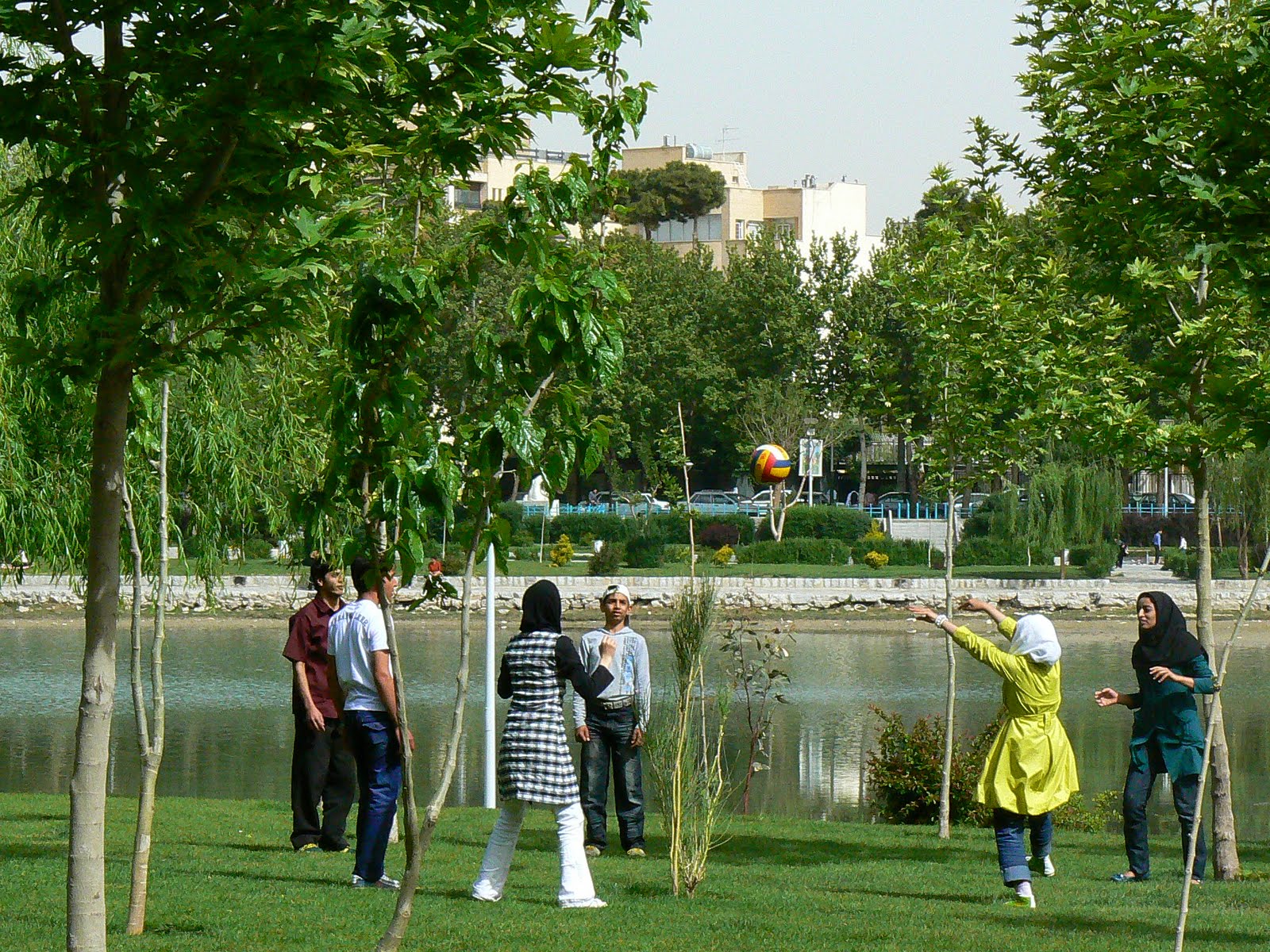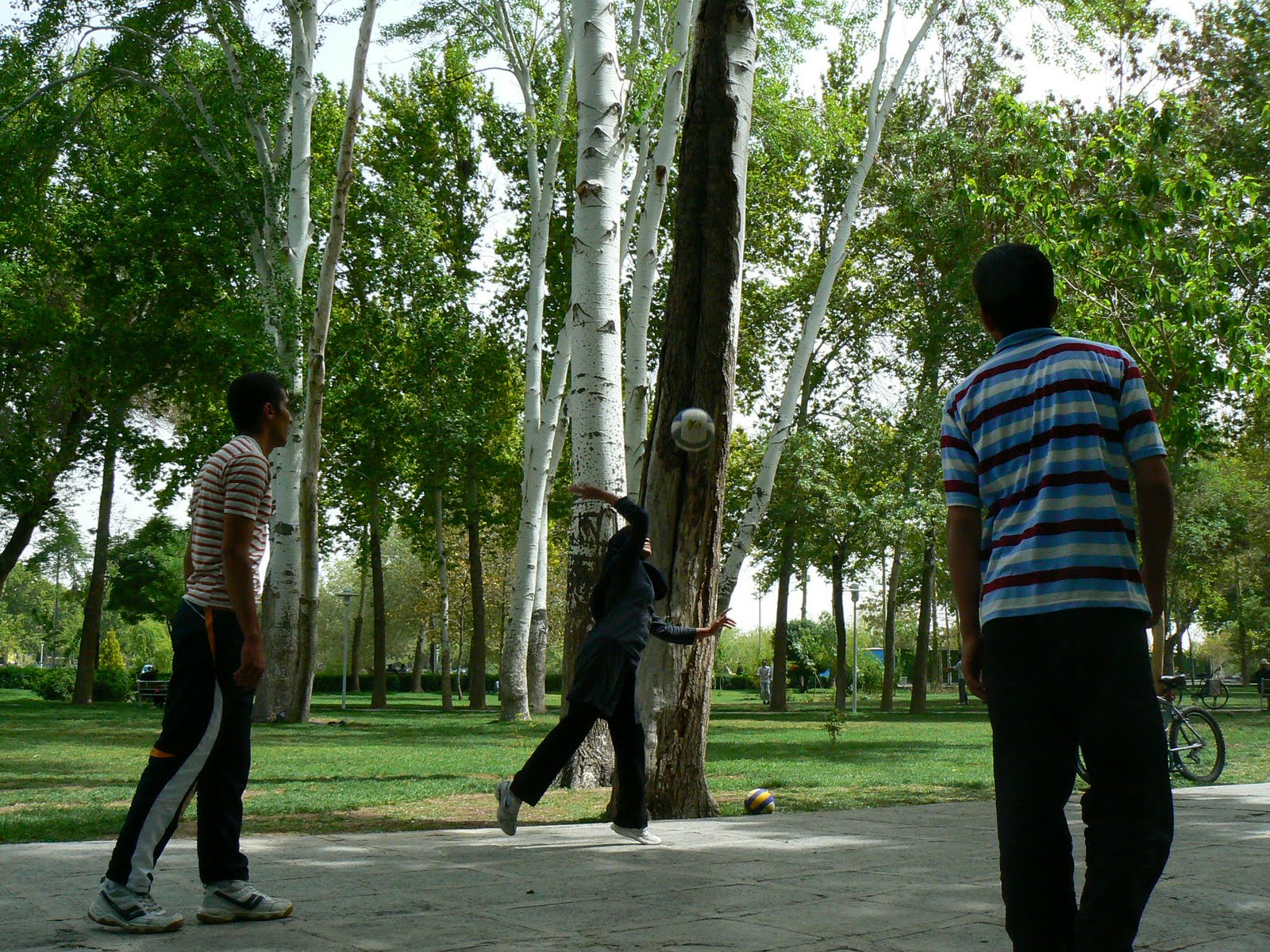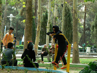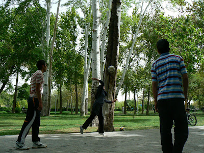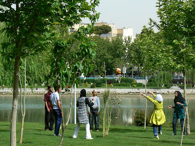Pana la urma, am acceptat invitatia la un grup de tineri. Ei erau din Esfahan, deci nu venisera cu cortul, dar iesisera la iarba verde. Unul dintre ei vorbea bine engleza, era mecanic auto, ceilalti prieteni mai rupeau si ei, pe ici pe colo. Era o gasca sportiva. Venisera sa joace fotbal si mai ales volei… Erau de altfel multe fete care jucau volei – da, in chador si cu ceva pe cap, dar jucau volei si unele erau chiar bune ! Alte tipe mergeau pe biciclete, iar unele chiar faceau mushi la niste aparate amplasate in parc. Ce gym ? Parcul era de baza.