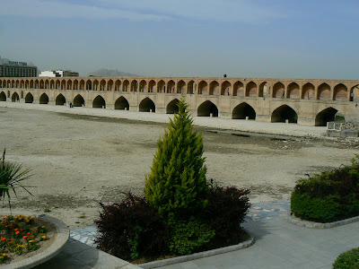 Am pornit la drum spre sud. Esfahanul este strabatut de raul Zayandeh care de foarte multe ori e secat… Intr-o tara cu o cenzura destul de puternica, zvonurile sunt la ordinea zilei. Ultimul zvon este ca ceva politician sau ayatolah strange apa din munte si o vinde in Israel la preturi astronomice… Vanduta sau nevanduta, cand m-am plimbat eu pe malul raului, nu prea era apa, in schimb m-am bucurat de celebrele poduri construite unele dintre ele de Sah Abbas pe la 1650… Cel mai faimos este podul Si-o-seh, podul celor 33 de arcuri, sub care infloresc diverse cafenele.