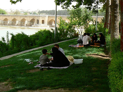 Dupa ce trec raul, o voi lua la plimbare pe malul raului. Peste tot, corturi si familii intregi la picnic… Cum am mai spus la un moment dat, iranienii sunt mari calatori, le place sa viziteze si sa cunoasca. Putini ies din tara, mai ales din motive economice si a dificultatilor insurmontabile in a pune mana pe vize. De altfel, tari precum Armenia sau Azerbaijanul sunt pline cu turisti iranieni care se duc sa vada cum e in tarile in care femeile nu poarta nimic pe cap.