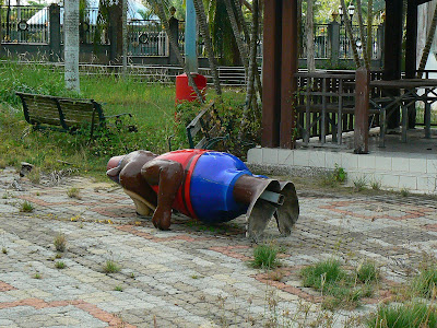 Ultimul obiectiv “only in Brunei” vizitat a fost parcul de distractii Jerudong. Acesta a fost construit de sultan si oferit ca un cadou cu ocazia zilei lui de nastere poporului din Brunei sa aibe unde sa se distreze. Sa nu credeti ca era un EuroDisneyLand, dar intr-o tara cu putine oportunitati de distractie, a fost un wow… Nu a mai fost un wow dupa 2000 cand sultanul lovit de datorii si proiecte gen Empire Hotel. A meritat vazut… este pustiu si ai senzatia ca te afli intr-unul din acele filme hollywoodiene apocaliptice in urma careia lumea dispare, iar in urma raman cladiri care se degradeaza (filme gen “The day after” sau “Planeta Maimutelor”). Banuiesc ca asa arata si Pripyat, orasul abandonat de langa Cernobal… Am fost in timpul saptamanii, am inteles ca in weekend e mai multa lume, dar cred ca a fost o experienta mai memorabila…. un parc de distractii gol, paraginit, o dovada a investitilor facute fara cap…