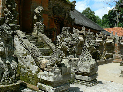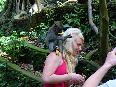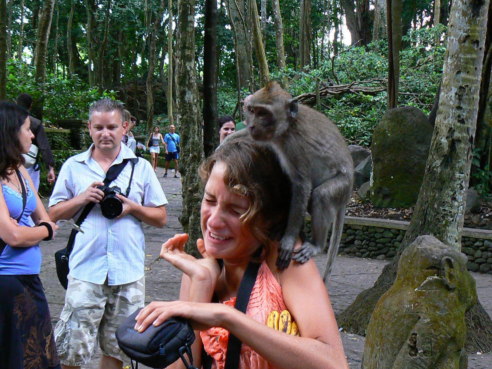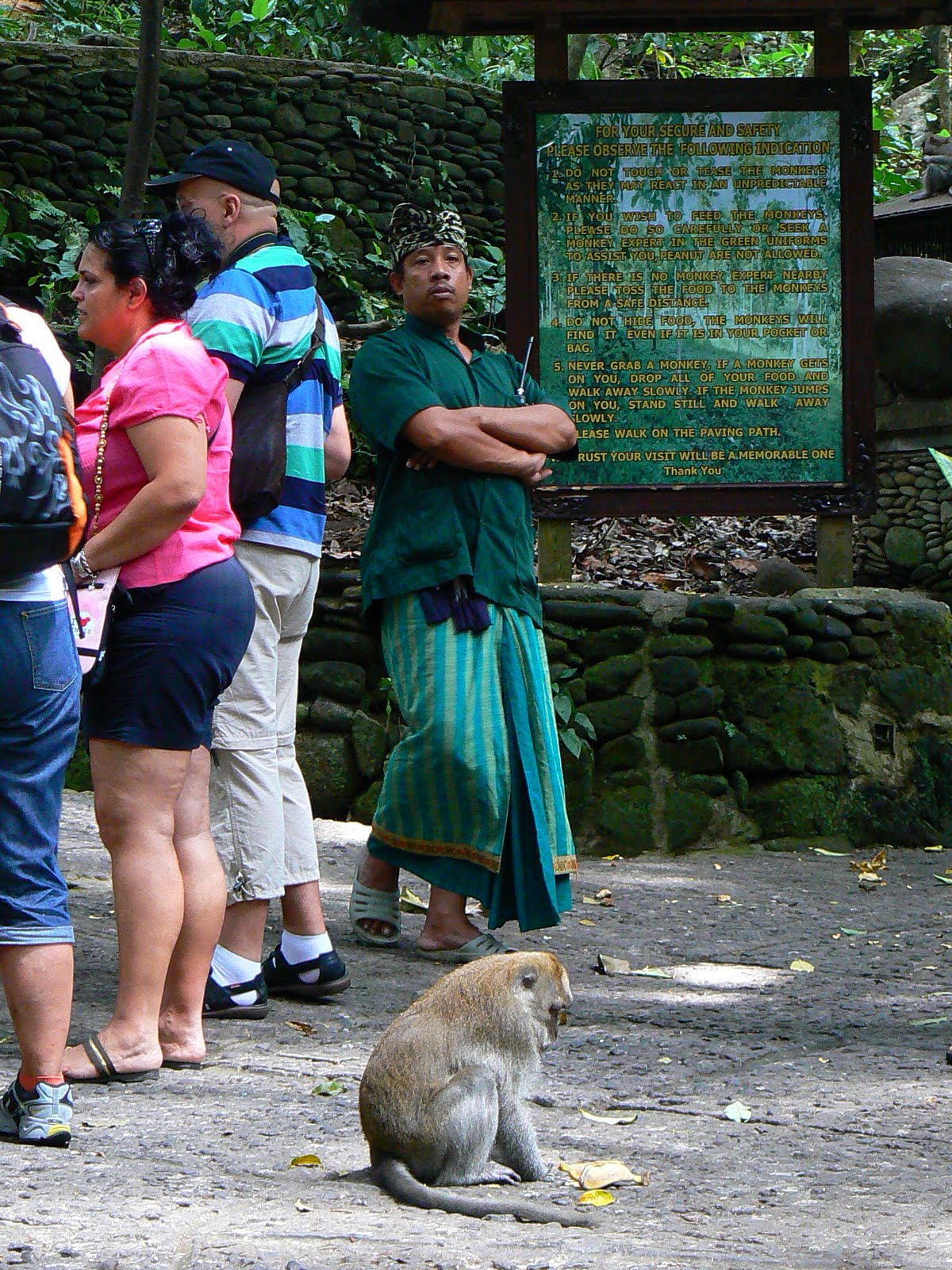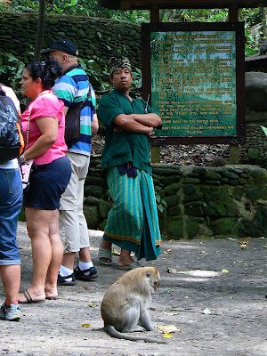Luand-o la picior, in cateva minute, am ajuns in padurea maimutelor sau Sacred Monkey Forest Sanctuary… este probabil locul cel mai turistic din Ubud si se afla obligatoriu pe intinerariul tururilor care vin dinspre coasta… Asa ca cu cat ajungi mai devreme, cu atat mai bine, eviti hoardele bronzate de pe litoral. Balinezii sunt hindusi, iar regele maimutelor Hanuman l-a ajutat pe Rama in recuperarea sotiei sale Sita din mainile lui Ravana, asa ca maimutele sunt sacralizate in intreaga lume hindusa… Nu va asteptati la niste maimute prea evlavioase, dimpotriva… Sunt extrem de agresive si simt bananele sau orice altceva de mancare chiar daca ar fi camuflate in vreo geanta de plumb. Se bat intre ele si pasiunea lor cea mai mare este sa se suie in capul turistilor… in caz ca chiar ai probleme cu maimutele, conform indicatiilor de la intrarea in padure, trebuie sa ceri ajutorul unui “monkey expert” care se gasesc peste tot prin parc. Sa nu ma intelegeti gresit – nu e o experienta rea, locul este extrem de haios, trebuie doar sa nu le agiti prea mult si sa nu te bati cu ele pe banane !