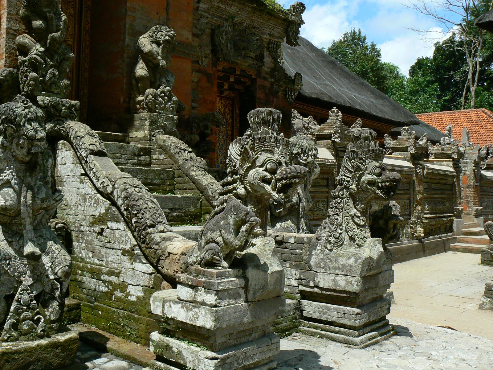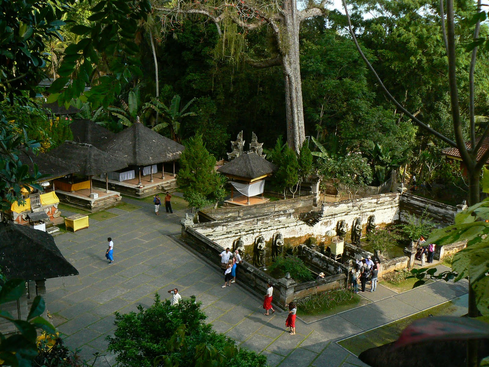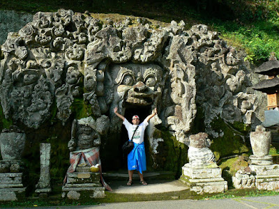 Din Ubud, poti sa vizitezi si doua complexe religioase din apropiere. Poate cel mai spectaculos este Goa Gajah (Pestera Elefantului)… Punctul forte al complexului este o mica pestera in care intri prin gura unui monstru, inauntru fiind un simbolul falic al lui Shiva, dar si cel feminin, yoni, precum si o statuie a simpaticului zeu cu cap de elefant, Ganesh… Dar poate cea mai spectaculoasa panorama care o ai sunt fantanile alimentate cu apa din niste statui reprezentand femei bine dotate cu niste vase in mana… La intrare, racoreste-te cu niste suc de nuca de cocos, baut cu paiul direct din nuca de cocos, si exploreaza si zona din spatele templelor, prin orez…