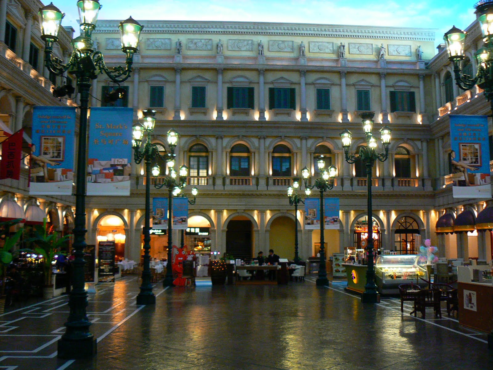 Dar socul a venit cand am terminat acest culoar de sute de metri… Am ajuns pe canalele Venetiei… de jur imprejur, casele si palatele Venetiei copiate in cele mai mici detalii, inclusiv o replica aproape in marime naturala a Pietei San Marco si canale strabatute de gondole cu gondolieri europeni… Am petrecut ore in sir plimbandu-ma prin cartierele Veneziei de Macao, pe canale, uitandu-ma prin magazinele de lux si nu numai sau mancand intr-un food court gigantic unde gaseai de toate, inclusiv McDonald’s sau Burger King pe langa tone de mancare chinezeasca… Inutil sa spun ca in acest spatiu gigantic erau si restaurante de lux, gelaterii sau pizzerii. Nu pot decat sa spun ca incredibil este plafonul care replica o zi insorita in Venezia, intensitatea luminii “cerului” artificial reducandu-se odata ce afara se apropia noaptea ! Ma plimbam de-a lungul canalelor si filmam si fotografiam ca un nebun… Nu eram singur,.,.. erau mii de oameni ! Unii cumparau, altii mancau si multi stateau la coada sa se plimbe cu gondolele – iar gondolierii erau europeni, parand 100% autentici (nu cred ca erau insa italieni, judecand dupa accentul cu care vorbeau italiana, dar unii dintre ei, erau cu siguranta macaronari vero).