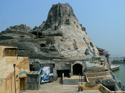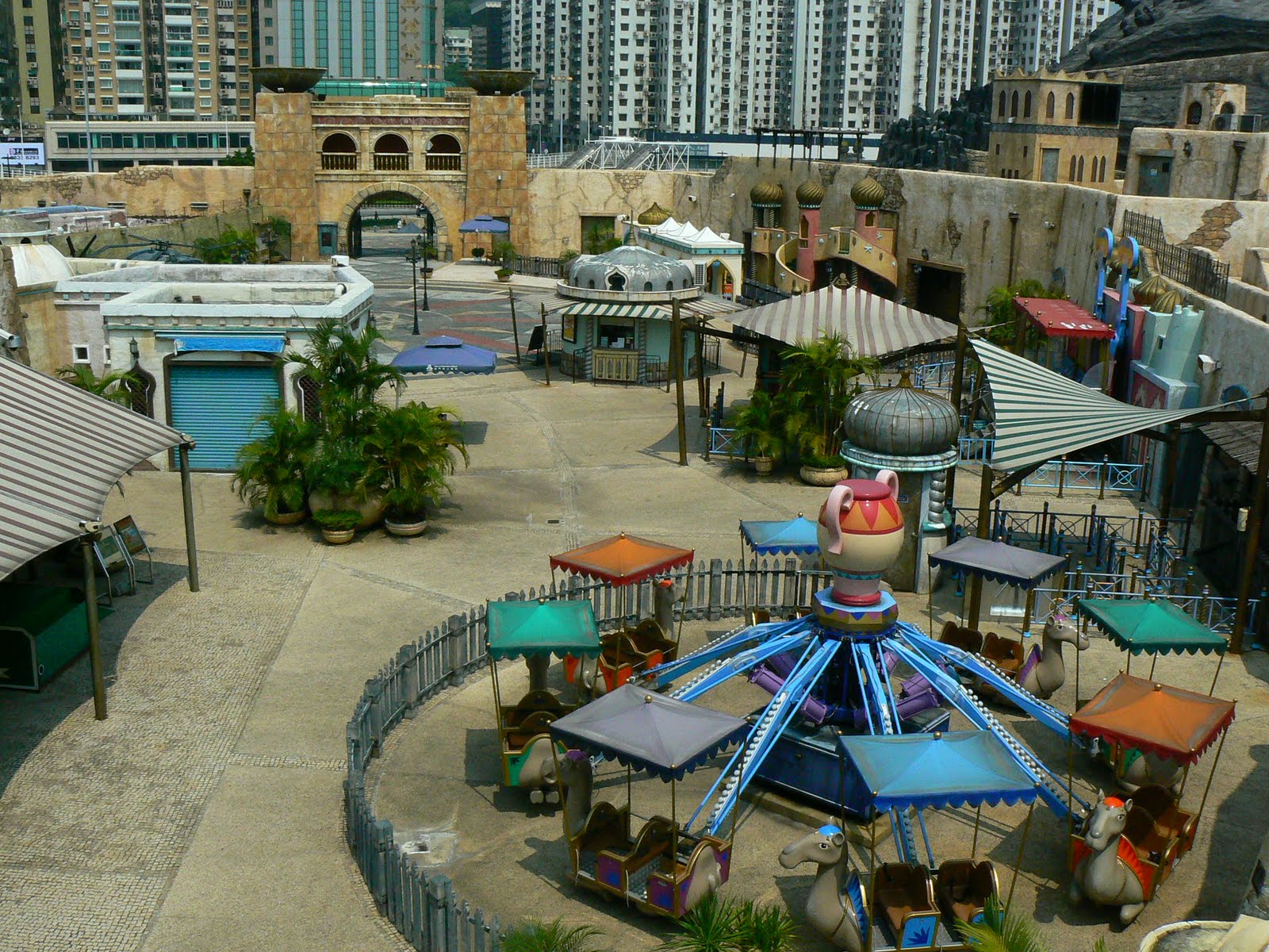 Dar sa revin la primii pasi in Macao… in fata portului, zeci de autobuze si microbuze, unul mai colorat decat altul te asteptau sa te duca gratuit intr-unul din cele circa 30 de cazinouri din teritoriu. Dar nu m-am uitat cu mare atentie… de cum debarcasem, observasem un soi de parc de distractie langa port, recreand locuri cunoscute de pe mapamond – Vezuviul si o cetate chinezeasca amintind de Orasul Interzis din Beijing. M-am apropiat… era mult prea dimineata, cam ora 9:00, era un parc de distractii. In Vezuviu era o discoteca, printre minarete arabe se plimbau trenulete, iar la intrarea in parc, dadeai peste palatul Potala din Lhasa, Tibet. Am luat-o apoi la picior pe langa Colliseum printre ruine grecesti si am ajuns stupefiat in fata… Columnei lui Traian ! Iata si micul colt de Romanie din Macao !