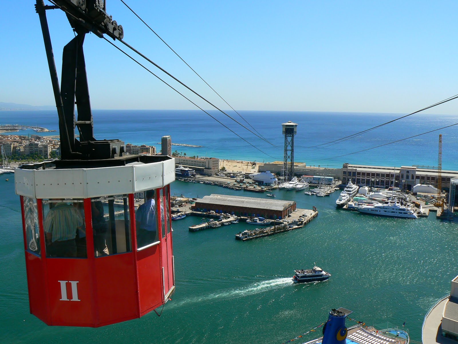 Dupa ce ati coborat (si ati fost frustrati ca geamurile nu sunt prea spalate si deci pozele nu au iesit cristal), luati-o spre mare, spre World Trade Center… Nu e cazul sa faceti vreo afacere, ci sa luati telecabina spre Montjuic… “zburand” pe deasupra apei, ai din nou parte de o panorama incredibila….