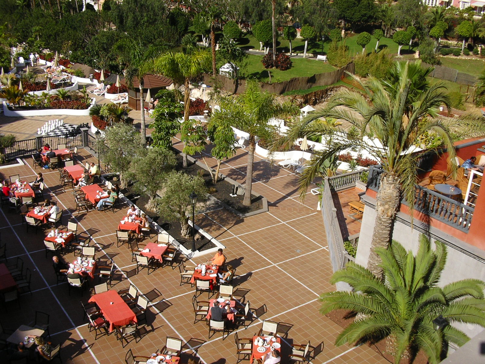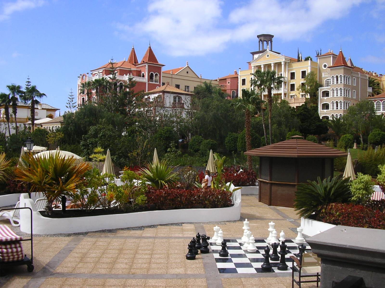 In fine, hai sa trec putin in revista hotelul… Camera era ok, nu pot sa zic insa ca m-a dat pe spate… Poate si pentru ca vederea era undeva la dos, cum ieseam descult in balcon, vedeam cativa palmieri, nu si albastrul piscinei, dar era ok. In schimb, curtea facea toti banii – larga, generoasa, plina de vegetatie exotica. In plus, puteai sa te bucuri de panorama patio-ului din diverse unghiuri – balcoane, terase sau daca te urcai cu liftul cu pereti transparenti pana in varful hotelului. In curte, era si o tabla de sah gigant, dar nu am vazut prea multi doritori de sportul mintii… ci mai degraba mai multi doritori de soare, de zacut pe malul piscinei si de baut Dorada, principala bere tenerifeza.
