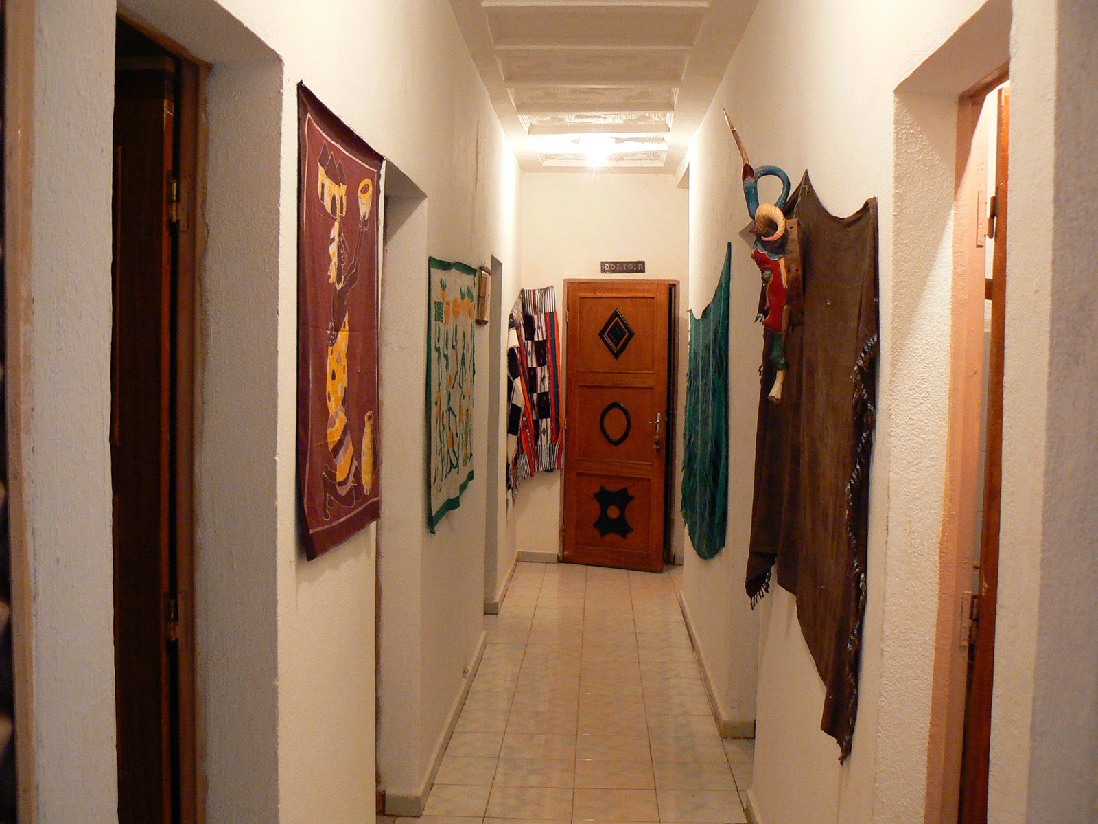 Primul contact cu hotelul l-am avut noaptea… Dupa ce ne-am hatanat pe niste drumuri cam desfundate, printr-un cartier cu putina lumina, am ajuns intr-un final in fata unei cladiri cu pereti ca de cetate, subtil luminata… Am ajuns la hotel…. In primul rand, este un hotel cu arhitectura traditionala… zidurile par ca de chirpici si culoarele aduc cu ingustele ulite din localitatile maliene. Inca de la intrare, ne intampina o imensa statuie dogoneza, iar prin interior gasesti destule statui sau alte artefacte… ai parte chiar si de un granar dogonez intre cele doua corpuri de cladire. Hotelul este deschis, suntem intr-otaraunde minimele sunt pe la 20 de grade, asa ca nu exista vreun acoperis care sa ingroape totul.