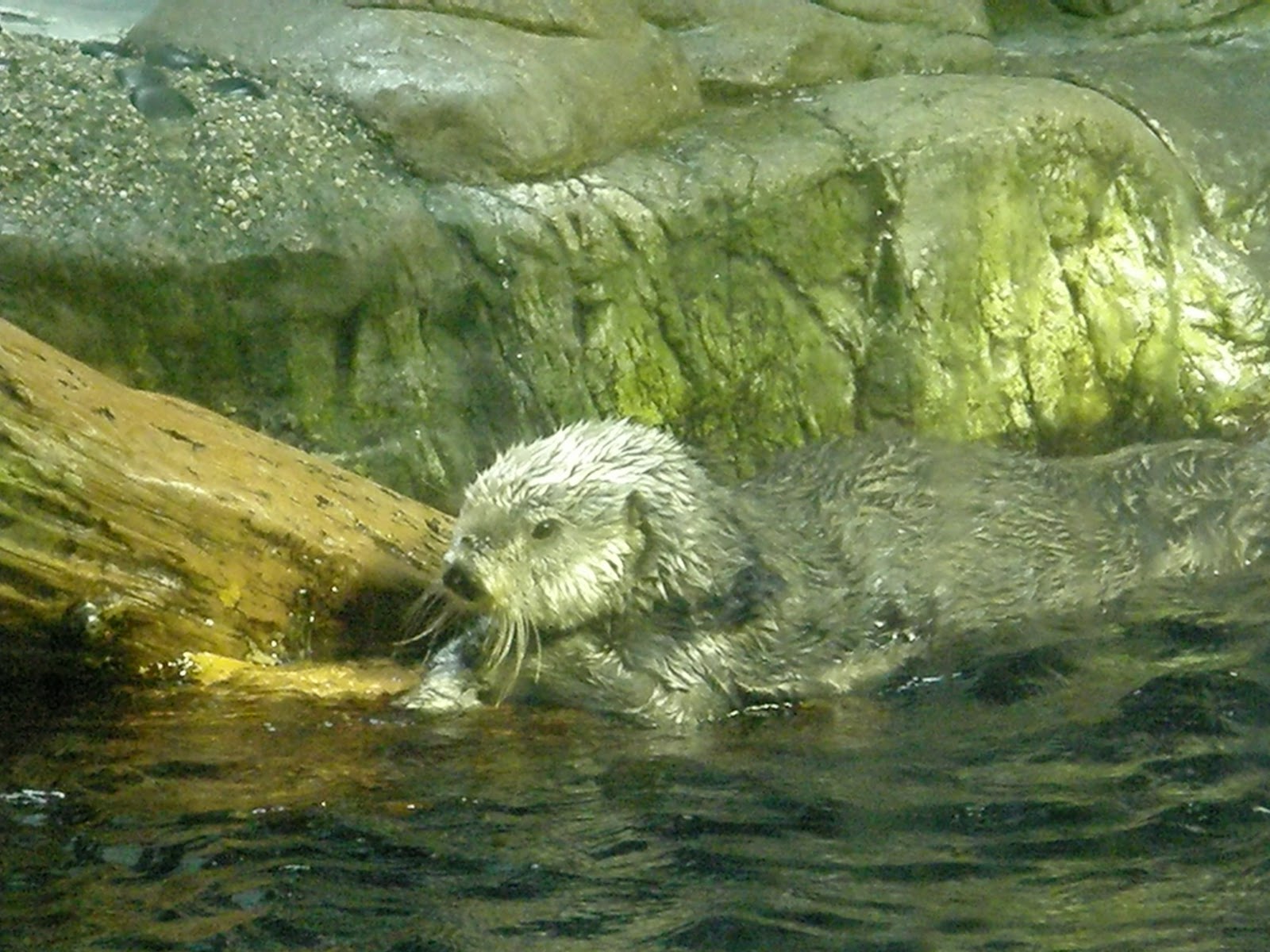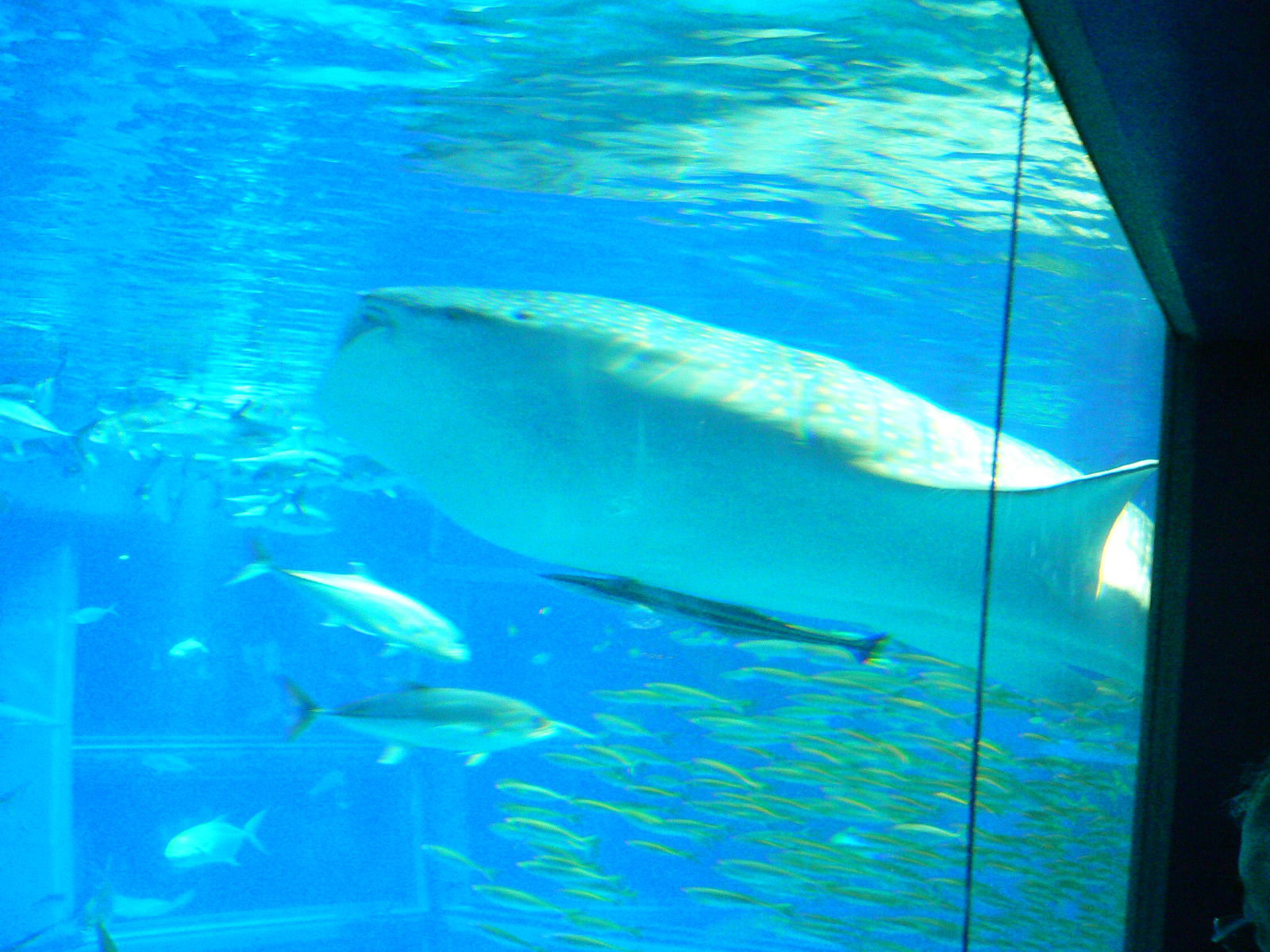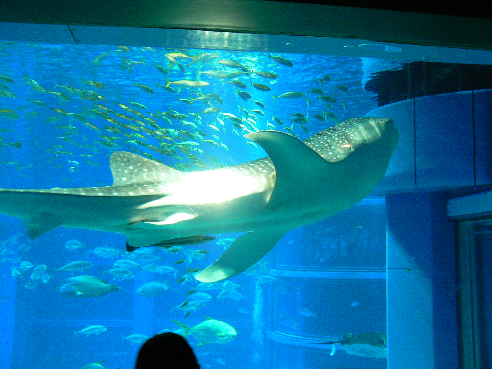 Dar toate expozitiile si bazinele sunt coplesite de imensul “Ocean Pacific” – un bazin care adaposteste numai putin de 5400 tone de apa (cel mai mare bazin din lume) si in care se afla “whale shark” – balena-rechin… Este o imagine absolut fabuloasa… aproape ca imi pare rau ca aproape ignor alte vietuitoare deosebite cum ar fi pisicile de mare sau alti rechini mai mici… Balena este impresionanta prin dimensiune si prestanta… se simte chiar si prin sticla acrilica ca nu ii pasa de nimeni si nimic, este mult prea mare sa se coboare la nivelul vreunui rechin oarecare… si de fapt cam toti o ocolesc… Ca spectacolul sa fie complet, in marele bazin a aparut si un scafandru care habar n-am ce facea, dar presupun ca avea vreo treaba.