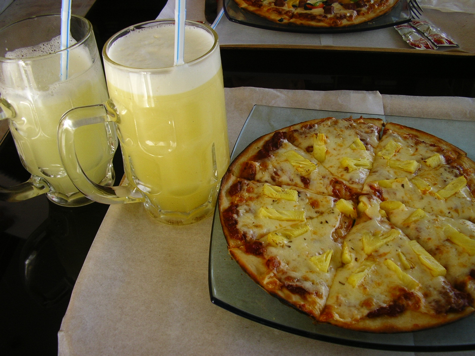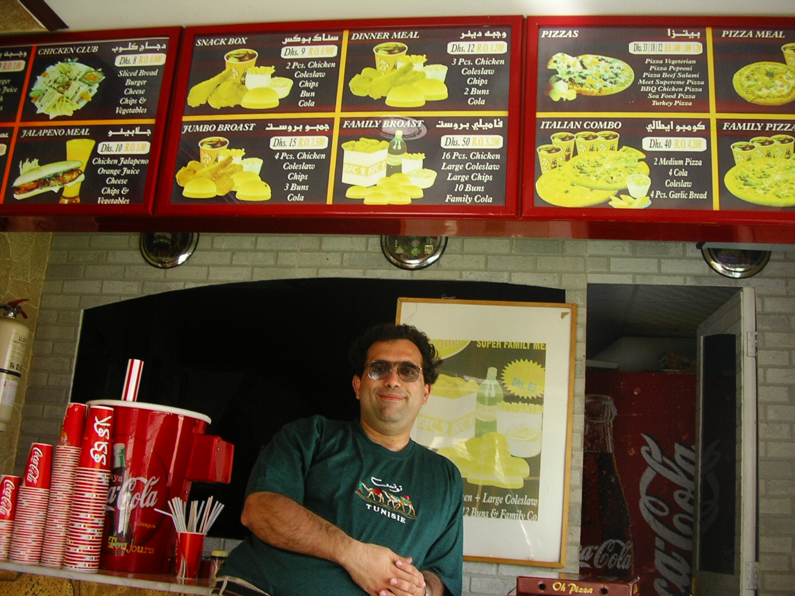 Spre sfarsitul dupa-amiezii, ne-a lovit foamea… Din pacate, viata era la fel de letargica, iar populatia de pe strazi la fel de absenta… Pana la urma, luand-o la pas pe strada principala, am ochit de la distanta o firma familiara…. Sa fie vreun KFC in acest loc uitat de lume ? Ei, bine, vazusem partial bine… era tot un Fried Chicken, dar nu Kentucky Fried Chicken, ci mandrul Buraimi Fried Chicken !!! Dar pana ca BFC sa ajunga la o faima planetara, am hotarat sa gustam din alesele-i bucate… Ei bine, spre surprinderea noastra, Buraimi Fried Chicken nu avea pui ! Ci doar pizza ! E drept, daca te uiti cu atentie pe meniu, mai vezi niste urme vagi de galinacee, dar baza e reprezentata de pizza si oricum cand am ajuns noi, nu aveau decat pizza… Am multumit totusi profetului ca am gasit un loc deschis si am mancat…