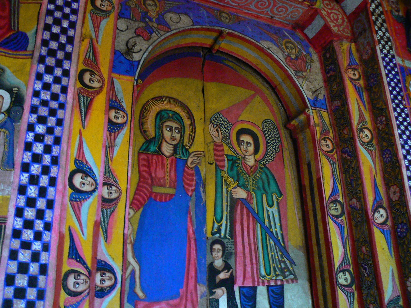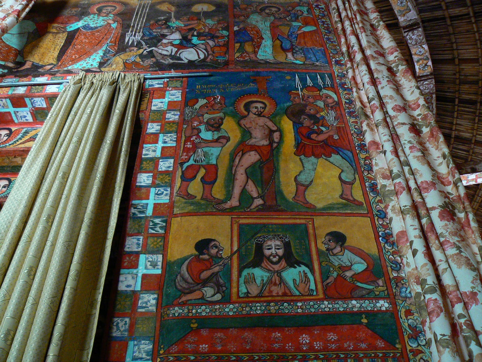 Am stat mult pe aici… am vazut pentru prima oara o biserica traditionala… Imi da senzatia de matriosca… in interior, exista o biserica (numita “Sfanta Sfintelor”, din nou, din traditia iudaica) in care nu pot intra decat preotii si in care se pastreaza cel putin un “tabot” – o replica a Chivotului Legii… exista peste 20.000 biserici in Etiopia si fiecare are cel putin un tabot. Evident, si aceste replici sunt ascunse ochiilor profanilor, nu neaparat faranjilor. Pe aceasta “biserica” interna sunt picturi superbe, similare cu cele din Bucovina, dar pictate pe o panza lipita de zid… nu pictate direct pe zid ca la noi… E o combinatie de Vechi Testament cu povestea lui Moise si Fuga din Egipt cu Noul Testament. Personajele pozitive sunt pictate din fata cu ochii mari si expresivi, personajele negative din profil si li se vede doar un ochi… Asa, ca sa fie clar ! In jurul “Sfintei Sfintelor” se afla un coridor si apoi al doilea zid si apoi inca un coridor incercuit de un zid din lemn… O biserica intr-o biserica intr-o alta biserica. Si in plus, biserica traditionala este rotunda, un simbol al perfectiunii divine… cercul va fi intotdeauna perfect.