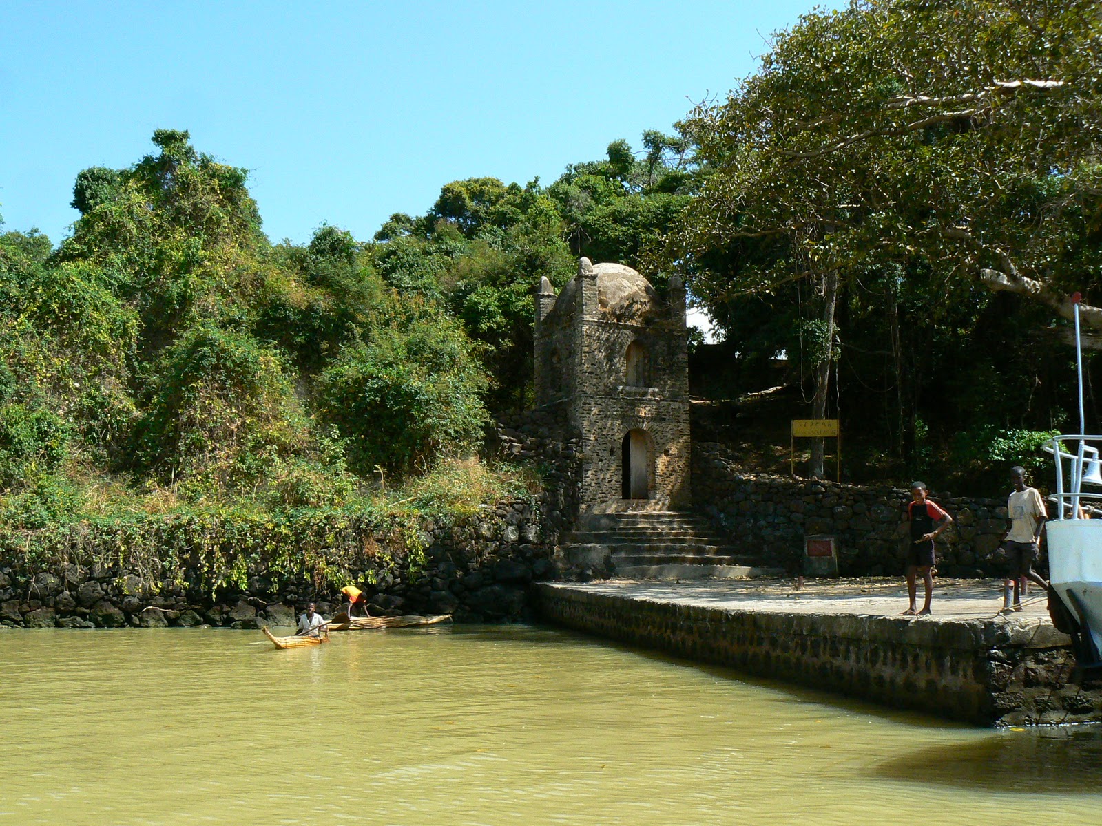 Plimbarea pe lac a fost extrem de placuta… Dupa trei zile in care am “inghitit” peste 1000 km, e o placere sa te intinzi pe barca, ascuns de soarele puternic de peste 2000 metri (suntem totusi la inaltime) si sa ne uitam la satenii care transporta diverse bunuri pe plutele lor de papirus… Si parca nici nu am simtit cele 2 si ceva ore pana am ajuns in mijlocul lacului la manastirea Narga Selassie. Se afla pe o insula in mijlocul lacului, destul de aproape de Dega Estefanos care pastreaza mumiile a catorva imparati etiopieni.