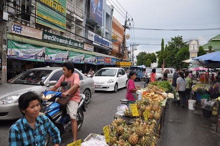 Ziua nu s-a incheiat aici, desi incepuse foarte devreme. Nu puteam rata o plimbare prin bazarul de noapte din Chiang Rai, unul dintre cele mai frumoase din Thailanda. Eu ajunsesem aici prima oara anul trecut, in drum spre Laos, si eram nerabdator sa ma pierd printre tarabele si magazinele unde poti gasi suvenire de foarte buna calitate si accesibile ca pret. Bazarul este mult mai mic decat cel din Chiang Mai sau decat pietele din Bangkok, insa atmosfera relaxata, clima din aceasta regiune de munte si oamenii foarte zambitori iti vor ramane in suflet. Bazarul are doua piete mari, fiecare cu cate o scena unde au loc, in fiecare seara, spectacole de dans si concerte. Una dintre piete este mereu plina de localnici, iar pe laturile sale se gasesc mici tarabe cu specialitati culinare thailandeze si cateva mancaruri bizare.