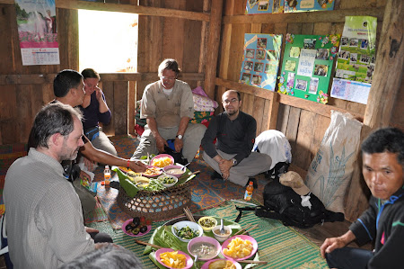 Peste tot in sat am vazut oameni batrini stand la umbra si copii alergand prin jurul caselor, facand o mare galagie. Copiii sunt la fel peste tot J. Se joaca, alearga, se uita curiosi si rad la noi. Fiind duminica, satul este plin de copii care nu au zi de scoala, iar in centrul satului sunt multi barbati care stau la taifas. Ni se explica faptul ca, in timpul saptamanii, satul este aproape pustiu, deoarece toti barbatii si multe femei sunt la munca pe dealurile din jurul satului, unde sunt plantatiile de orez, zarzavaturi si fructe, in vreme ce copiii sunt la scoala. Turul nostru include si o vizitare a scolii, care este insa pustie. In cazul in care vizita se face in timpul saptamanii, turistii pot asista la ora de curs si pot acorda cateva daruri copiilor care au foarte rar sansa de a vedea straini in satul lor. Probabil ca, in viitor, acest lucru o sa fie mai des, insa doar sub stricta supraveghere a Organizatiei Community Based Tourism. Banii platiti de turisti pentru aceasta zi petrecuta in sat ajung la sateni, care, astfel, se bucura de vizita turistilor. Nu veti fi niste intrusi intr-un sat in care va opriti jumatate de ora, in cadrul unui tur organizat pentru a face cateva fotografii, si apoi va continuati turul spre un alt obiectiv. Aici, prin vizita in satul Huay Kee Lek, ajutati comunitatea locala sa aiba sansa la un trai mai bun, sa le ofere copiilor lor o educatie mai buna si va veti simti niste oaspeti primiti cu zambetul pe buze de intreaga comunitatea, de la copii pana la batranii satului. Aceasta dimineata a continuat cu o plimbare de aproape doua ore prin padurea din jurul satului, admirand peisajul de munte si descoperind plantele folosite de batranii satului in medicina traditionala. Plimbarea ne-a facut, desigur, pofta de mancare, iar la intoarcerea in sat am fost invitati la o familie acasa, pentru a lua pranzul. A fost o experienta de neuitat, un pranz simplu intr-o casa de bambus, la mii de kilometri distanta de casa. Nu am avut parte de delicatese, insa atmosfera simpla si prietenoasa din casa acestei familii Akha o sa imi ramana intiparita in minte pentru totdeauna.