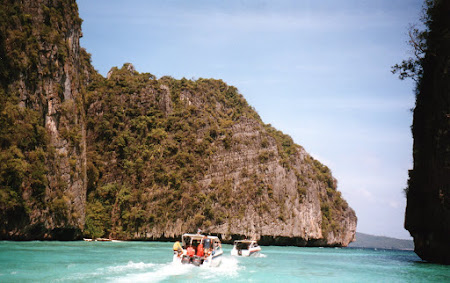 Si pentru ca toata ziua a fost dedicata baii in mare, dupa pranz si binecuvantata siesta din Phi Phi Don, ne-am imbarcat din nou pentru a ajunge intr-un loc magic… Am revenit in Phi Phi Leh, dar am intrat printr-o stramtoare ingusta intr-un soi de lac interior absolut superb. Daca va uitati la clipul de mai de sus cu trailerul de la The Beach, exista o filmare din elicopter… acolo se vede clar unde e acest lac interior…