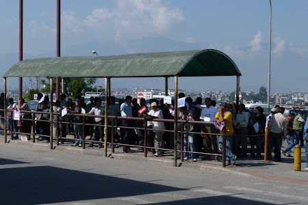 Sa lasam insa politica la locul ei pentru ca nu am vazut prea multe steaguri rosii si seceri pupandu-se cu ciocane pe strazile noului Nepal si sa ajungem la mult iubitul si stimatul birou de emigrare, adica acolo unde trebuia sa platim viza si sa intram in tara. Desi sub regim republican, Nepalul a pastrat bunul obicei de a da viza la sosirea pe aeroport, dar si bunul obicei al alcatuirii unei singure echipe care sa se dedice procesarii turistilor straini – o tanti capsa poza pe formular, cineva lua banii si dadea o factura, al treilea punea stickerul in pasaport si, de necrezut, era acelasi individ care si stampila stickerul, fiind un adevarat erou al multi-taskingului. Am uitat sa precizez ca tocmai aterizasera vreo patru avioane pline si am scapat din coada dupa vreo doua ore de asteptare. Fumatorii din grup s-au bagat in fata, ca intrasera deja in fibrilatii dupa zboruri atat de lungi.