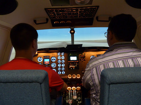 Hai sa trec insa la experienta pilotarii in scoala de pilotaj. Nu am fost singur, evident ca am avut un expert langa mine in persoana lui Dan Petrov care la 19 ani cred ca este unul dintre cei mai tineri piloti din Romania (nu are inca licenta de pilot de linie, insa urmeaza cursurile). Am intrat in sala simulatorului… reguli destul de stricte, inainte de a trece la mansa, am facut instructajul despre ce sa fac in caz de incendiu sau cutremur (nu, nu eram in avion, doar in sala simulatorului). Simulatorul insa arata excelent. Dan a zis ca mai exista un tip de simulator mai sofisticat care simuleaza inclusiv zdruncinatori in caz de vreme rea, dar pentru mine simulatorul de la Carpatair mi s-a parut foarte real.