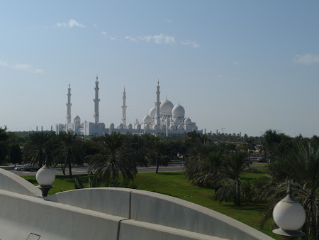 Daca Dubaiul a aruncat cu miliardele pe hoteluri-etalon, turnuri de 800 de metri inaltime si malluri mari cat un oras, ei bine, emirul din Abu Dhabi, om cu frica lui Allah, a decis sa iasa in evidenta nu cu megastructuri profane, ci printr-o moschee fara egal in lume (ma rog, exceptand Mecca si Medina). Asa ca emirul precedent, primul presedinte al Emiratelor, Seicul Zayed, a inceput constructia spectaculoasei moschei care acum ii poarta numele. Din pacate pentru el, Zayed nu a apucat sa se roage in ctitoria lui, dar fii-su, Khalifa (nasul turnului din Dubai), i-a indeplinit visul… Situat undeva in afara orasului, desi eram inca la kilometri buni pe autostrada, mi-a fost imposibil sa nu observ turnurile bulbucate ale moscheii care straluceau in soarele puternic din peninsula.