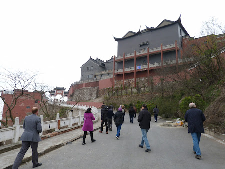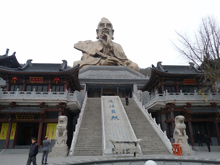 Asa ca ne-am transbordat si am luat-o in sus, de dealuri. Ce pacat ca cerul este asa de mohorat, ar fi fost o zi exceptionala… Dar si asa nu poti sa nu ramai cu gura cascata la vederea dealurilor pe varful carora se afla pagoda, temple, pavilioane, iar undeva, la picioarele unui deal, se afla o statuie gigantica. Ma astept sa fie Buda, am vazut pana acum numeroase statui gigantice ale fondatorului unei religii care cultiva modestia, dar nu e… e un chinez cu niste degete cam lungi… Mi se spune ca e Laozi, fondatorul taoismului, o religie aparuta aici, in China, pe cand budismul a fost importat de dincolo de Himalaya, din India. Dar pana sa ajungem la Laozi, masina se grabeste spre varful dealului unde se afla un complex de temple.