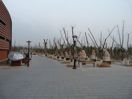Autocarul s-a strecurat pe nesimtite pe o poarta extrem de ingusta si apoi a luat viteza pe niste alei in jurul unei cladiri foarte, foarte lungi, aducand insa cu o sala de conferinta / hotel pe dinafara… O cladire care nu se mai sfarsea, inconjurata de deja obisnuitele helesteie, pomi, flori… Am coborat in fata muzeului sau ce Dumnezeu era si ma uitam dupa mesterii cioplitori. Ni se spune ca programul muzeului a fost prelungit pentru noi (suntem niste speciali, e clar ca lumina zilei, deja!) si o luam la descoperit muzeul… si din capul locului raman incremenit cu mana pe videocamera… Dumnezeule, ce au facut astia!!! O luam la picior pe culoare gigantice, printre niste statui imense, de dimensiuni cu adevarat faraonice. Ghidul spune ca exponatele istorice (sute si mii de Buda,coloane gigantice, o inscriptie care cica are peste 1.000 de ani) sunt donate de chinezii din strainatate, dar nu numai colectia este imensa, ci si display-urile te fac praf… adevarati munti cu monstri sculptati… cica piatra urma sa fie exportata, dar nu a primit autorizare de export si a ramas in China… evident, donate catre municipalitate, care ce s-a gandit… hai sa bage 1 miliard de yuani (adica peste 100 de milioane de euro) intr-un muzeu faraonic si un parc de distractii adiacent. Zis si facut! Nu le-au trebuit mai mult de doi ani pentru aceasta lucrare imensa si i-au dat drumul de curand. “In the middle of nowhere”, intr-o suburbie fara niciun trecut istoric… Vorba aia – firma noastra a construit o catedrala gotica secol XIV, palat dinastia Ming, secol XVI, si numeroase temple antice grecesti si romane. La cerere, putem construi Machu Picchu cu termen de livrare maximum 18 luni. Absolut impresionant! China surprinde la fiecare pas… nu trebuie sa te limitezi la Shanghai sau Beijing, vei ramane cu gura cascata chiar si daca te duci la Danyang. Adica locul unde s-a construit un muzeu care ar putea fi fala Berlinului, New Yorkului sau Parisului!