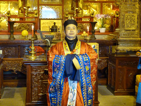Aici, o alta surpriza speciala pusa la cale de organizatori. Daca, dimineata, muzeul din Zhenjiang a fost deschis special pentru noi, acum, Zona Pitoreasca Maoshan a organizat o ceremonie taoista… Maoshan este unul dintre locurile sfinte ale taoismului si este un loc de pelerinaj pentru credinciosii taoisti din toata lumea… chinezeasca: China, Hong Kong – Macao, Taiwan, Singapore, SUA si multe alte locuri. Aici traiesc si calugari taoisti care au pus la punct ceremonia… imbracati in ros-albastru (am sperat ca va fi fost de bun augur pentru Steaua inaintea meciului cu Chelsea de la Londra, dar n-a fost sa fie), batand din tobe si orice alt instrument capabil sa faca zgomot, sub supravegherea unui calugar-sef care se roaga, se prosterneaza sau, pur si simplu, conduce orchestra, asist la prima slujba taoista din viata. E drept, daca o urmaresti prea atent, poti intra eventual intr-un soi de transa, si banuiesc ca asta si se intampla… Ghidul ne spune ca slujbele pot dura ore si zile in sir, timp in care participantii nu mananca, nu dorm, nu se odihnesc (de unde si povestile cu calugarii taoisti cu forte supranaturale), ghidul chiar jurand ca unul din marii maestri o pot tine incontinuu si o luna intreaga. Mai sa fie!!! Cineva din grup intreaba: daca vine un grup mai mare de turisti, pot fi organizate astfel de ceremonii? Nu, au loc doar cand trebuie sa aiba loc, daca prinzi, bine, daca nu, iar bine… si, in general, ai sanse mai mari sa prinzi un astfel de ceremonial primavara. Acum a fost organizat pentru ca veneau niste persoane asa de importante ca noi… oricum, odata porniti, calugarii taoisti nu pot fi opriti prea lesne, si desi noi plecaseram deja, ei se auzeau in continuare, iar ghidul ne asigura ca o vor tine tot asa pana dimineata! Bietii oameni, ce le-am facut!