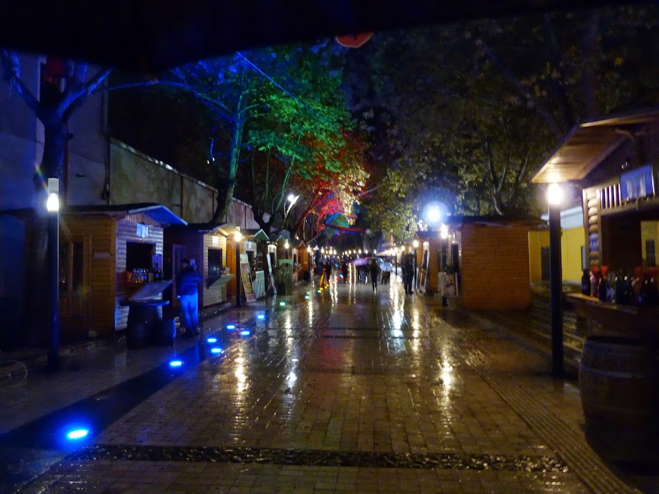 La doi pasi de piata, dau peste un soi de “Piata de Craciun”. Craciun in Albania? Pai cam 70% sunt musulmani… Ma rog, musulmani cu numele, nu le pasa prea mult de religie… Astfel ca Piata de Craciun pare mai degraba o piata de bauturi alcoolice – mai ales ca trei sferturi dintre standuri vand doar vin albanez… yap, Albania produce vin :). Curat tara musulmana!