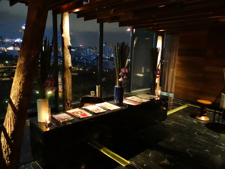 Am ajuns la So Sofitel cu ceva timp inainte de ora 17:00. M-am dus la receptie, le-am aratat mailul cu invitatia si apoi am fost condus la lift. Spa-ul se afla la etajul 11, nu este cel mai inalt etaj, e chiar in jumatatea inferioara, tinand cont ca tot hotelul are vreo 30 de etaje (si este unul dintre hotelurile scunde de 5 stele din Bangkok!). Desi nu e foarte inalt, compenseaza printr-un concept „zen” si, mai ales, panorama oferita.