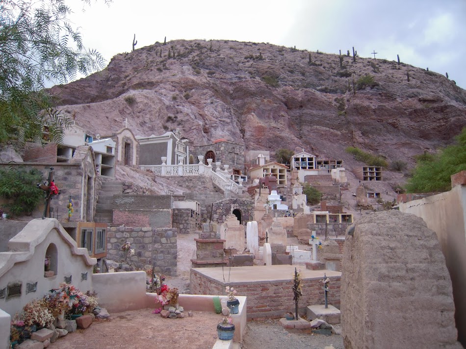 Am stat in Purmamarca, un sat mic de tot, pe cat de frumos, pe atat de ciudat, si nu doar pentru ca e la poalele unui munte caruia i se zice “Piatra in sapte culori”. Casele par a fi construite cu mana, fara cancioc, ca un castel de nisip. Fara unghiuri, fara linii drepte, colorate intr-una din cele sapte culori ale muntelui de mai sus. Brutalism naiv, daca exista asa ceva. Plimbarea in jurul muntelui vesel dureaza cam o ora si e minunata, mai ales cand ajungi in cimitirul satului, la fel de vesel si el. In sat e o straduta care urca inspre acest munte, a tot fost pictata de-a lungul timpului. Apoi, mai e un copac multisecular in carje si o biserica.
