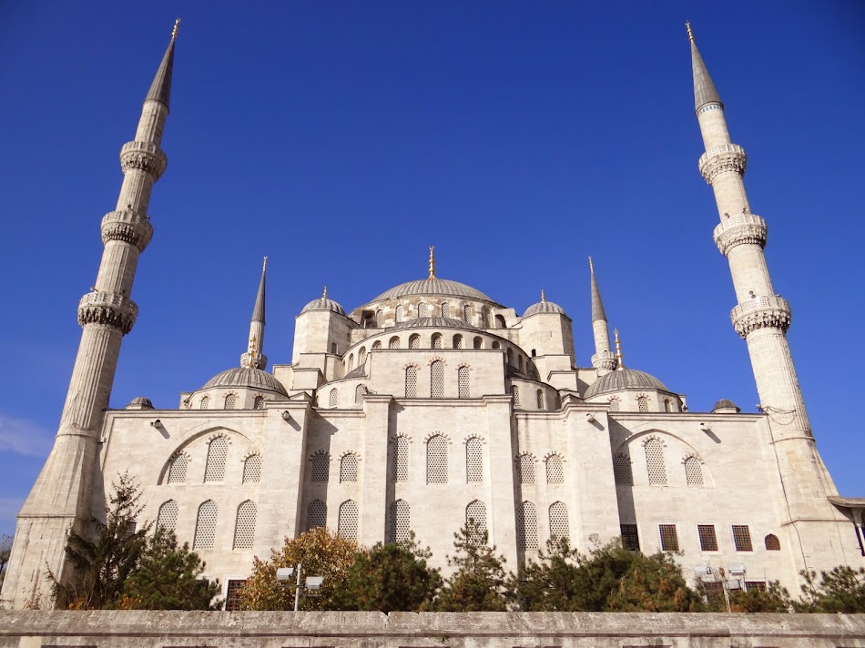 Vis-à-vis se afla Moscheea Albastra, ambitia sultanului Ahmed (1603-1617) de a construi o cladire care sa rivalizeze cu Catedrala Sfanta Sofia. A fost construita pe ruinele Marelui Palat Bizantin, palatul imparatilor, si este cea mai mare moschee din Turcia. Are sase minarete, un lucru care a atras multe remarci negative in acea perioada… Daca cineva construia o moschee, trebuia sa aiba un minaret. Daca o autoritate sau un nobil construia o moschee, atunci putea sa-i mai adauge unul. Daca un sultan construia o moschee, apai putea sa-i construiasca patru minarete, dar in niciun caz sase, pentru ca moscheea de la Mecca avea sase minarete si aceasta trebuia sa fie moscheea cu cel mai mare numar de minarete. Legenda spune ca atunci cand sultanul Ahmet l-a chemat pe arhitectul Sedefkar Mehmet Aga sa-i construiasca o moschee mai maiestuoasa decat Sf. Sofia, i-ar fi ordonat sa construiasca “altın minare”, adica minaretele sa fie aurite, iar arhitectul ar fi inteles „altı minare”, adica sa aibe sase minarete! Ma rog, se pare ca arhitectul, depasindu-si bugetul, ar fi decis de la sine putere sa nu inteleaga mesajul sultanului, cert este ca Moscheea lui Ahmet are sase minarete, lucru care a atras multe critici in vremea respectiva. Ca sa rezolve problema, Ahmet a decis sa construiasca cel de al saptelea minaret la Mecca, asa ca toata lumea a fost in cele din urma multumita (acum moscheea de la Mecca are noua minarete, deci nu se mai pune problema de vreun sacrilegiu!).