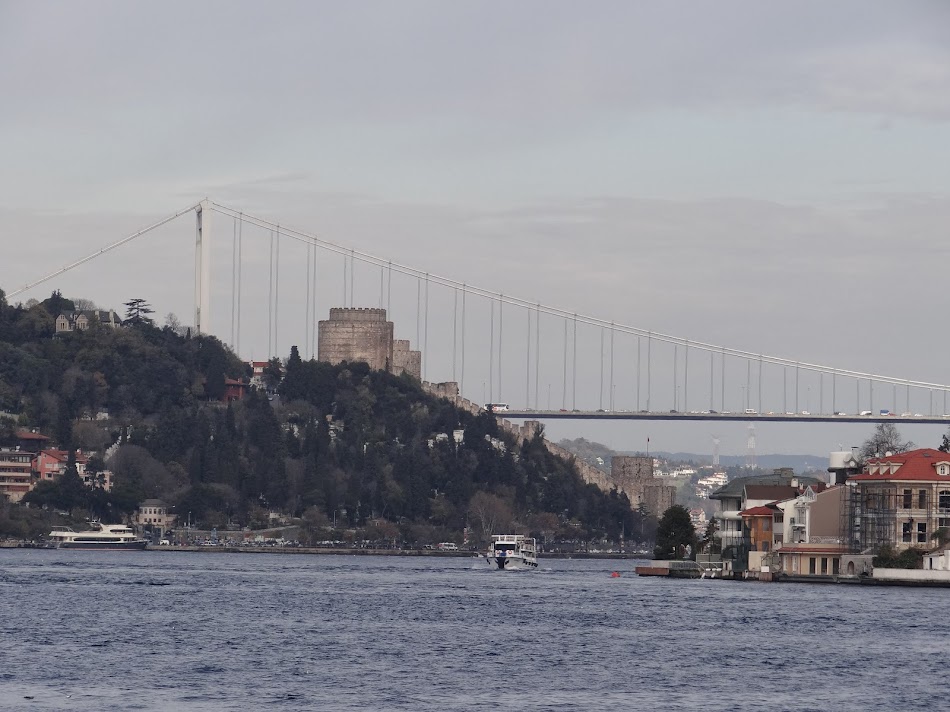 Am trecut pe sub primul pod si, dintr-odata, orasul a cam disparut… departe de frenezia marii metropole, de-a lungul Bosforului se intindeau orase si sate linistite, cu case destul de mandre (nu oricine isi permite o deschidere la Bosfor), vilisoare si blocuri, pescar, etc. etc… Era o duminica linistita in care lumea iesise la plimbare. Intre timp, pe nesimtite, ajungem in dreptul celui de al doilea pod, Mehmet Fatih. Aici, pe malul european, se afla impresionanta cetatea Rumeli Husari, construita de Mahomed Cuceritorul in timp ce pregatea asaltul final pentru a fi sigur ca are stramtoarea Bosfor sub control (a construit si o alta cetate mai mica, dincolo, in Anatolia – Anadolu Hisari). Facem poze in viteza ca barca noastra a si intors, cap compas, inapoi, Istanbul.